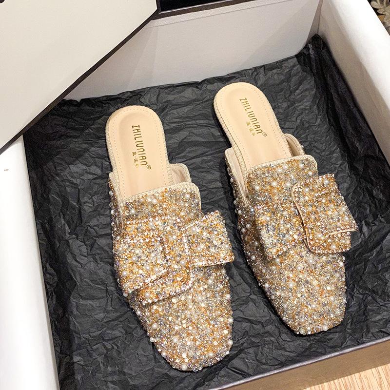 Женские элегантные летние универсальные тапочки на плоской подошве с квадратным носком, украшенные стразами, женские уличные туфли Muller — купить товар онлайн с бесплатной доставкой по всему миру!
