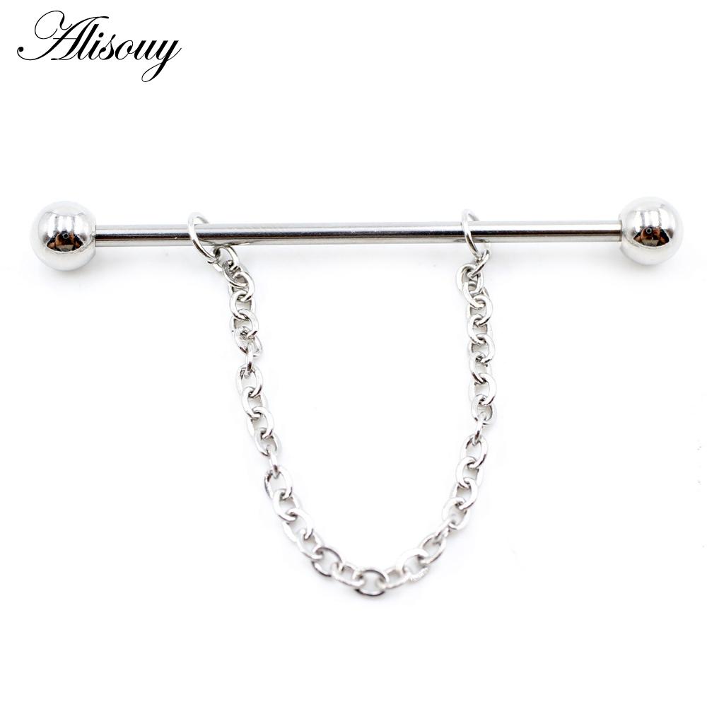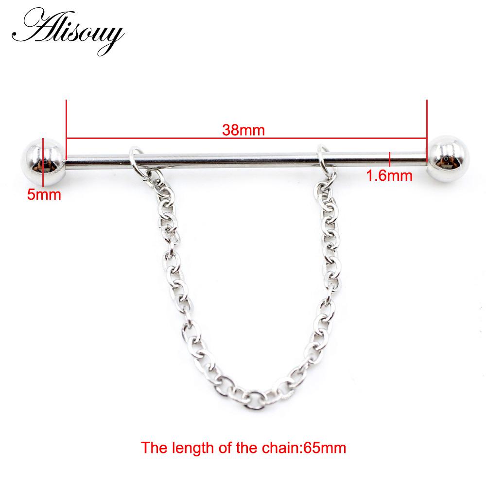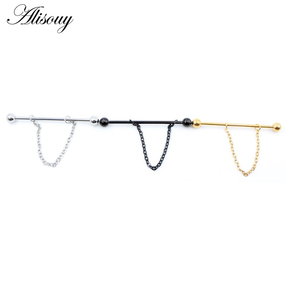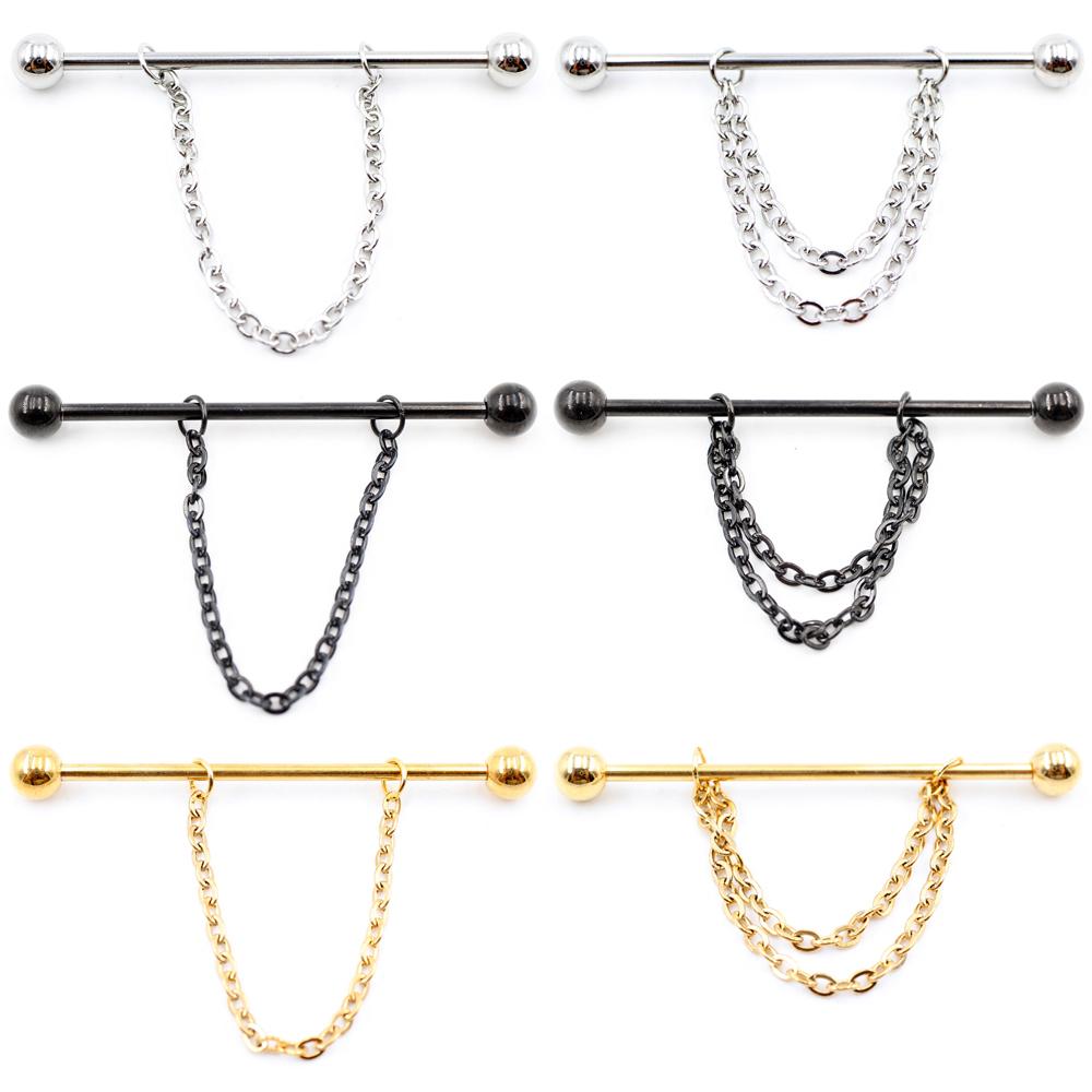 Alisouy 2PCS Круглая Цепочка Шариков Длинная Нержавеющая Сталь Промышленная Штанга Серьги Для Хряща Уха Прямые Серьги-Шпильки Пирсинг Украшения Для Тела