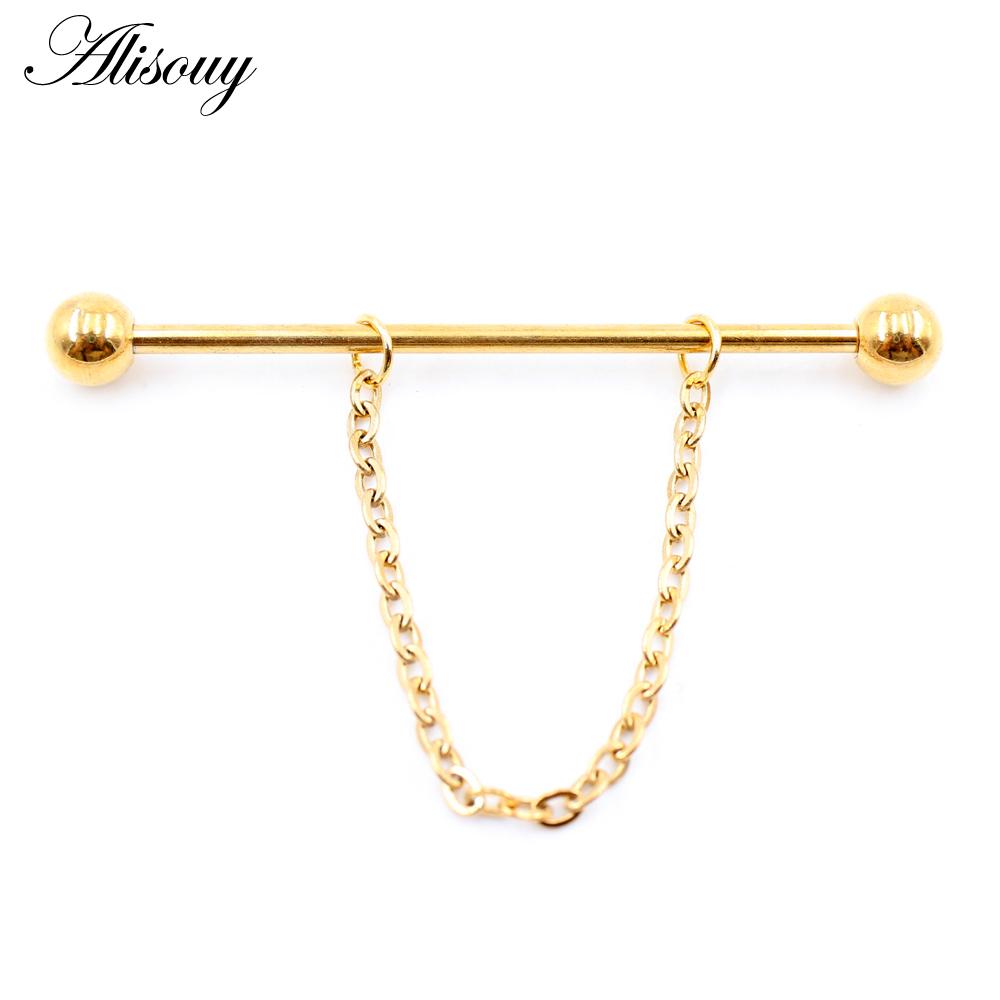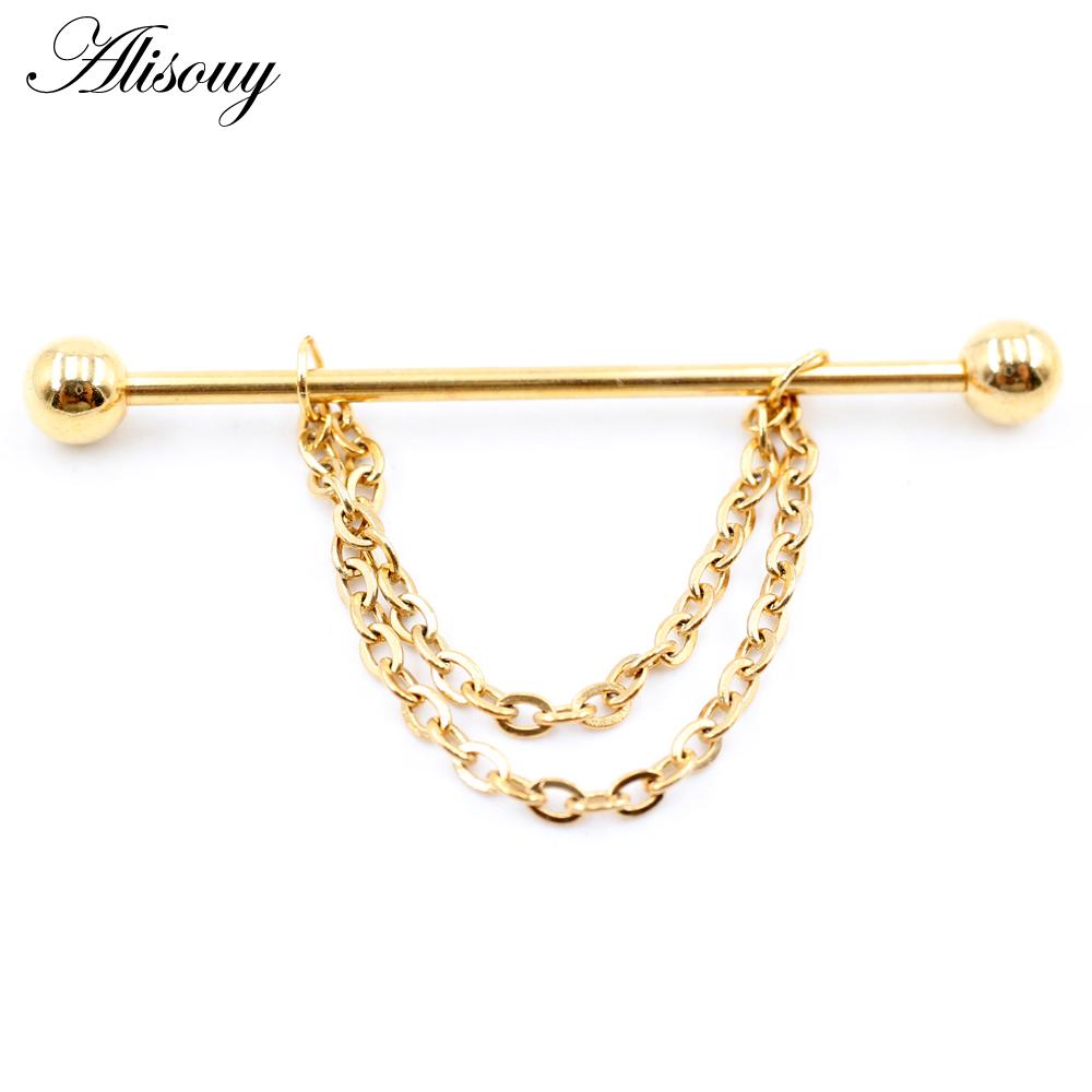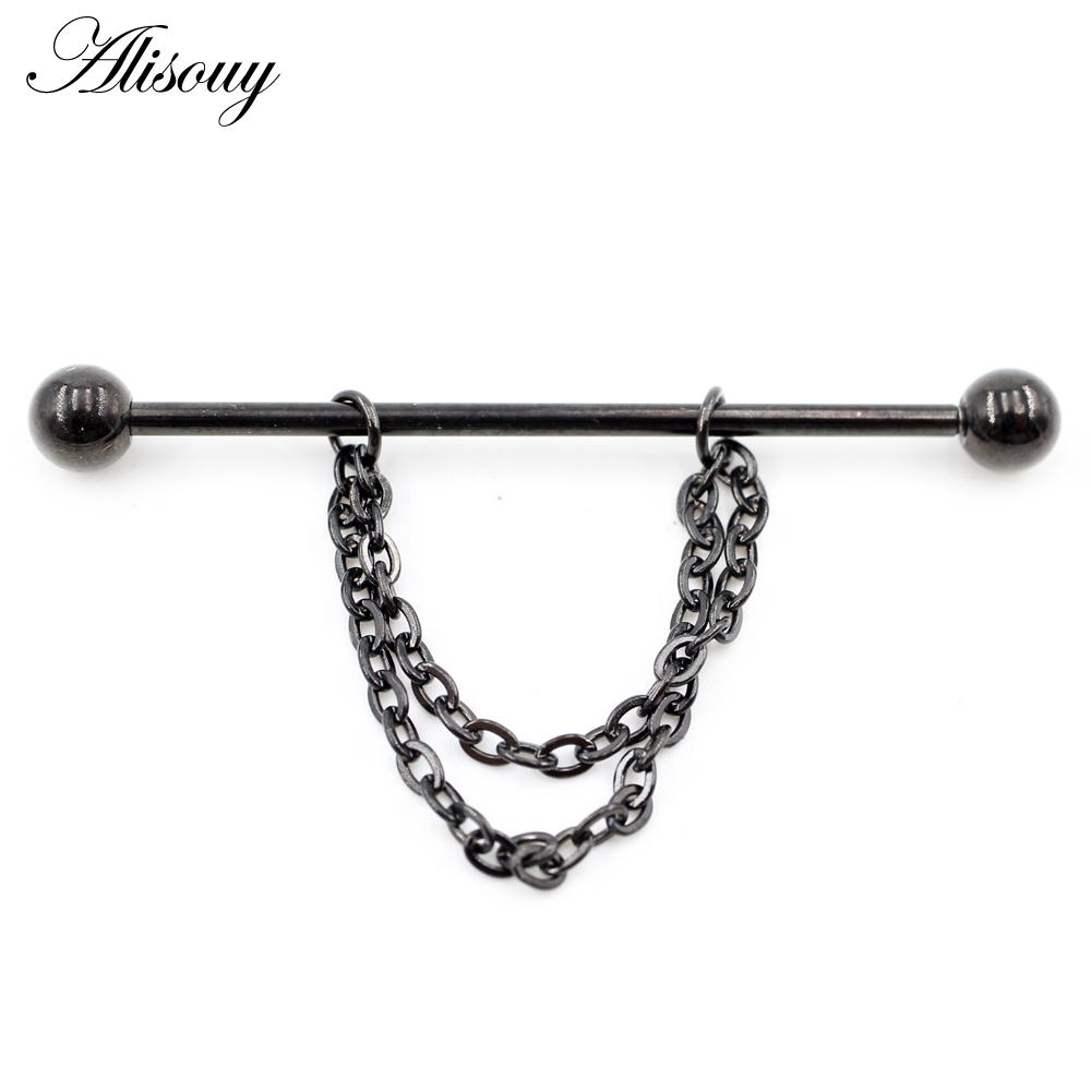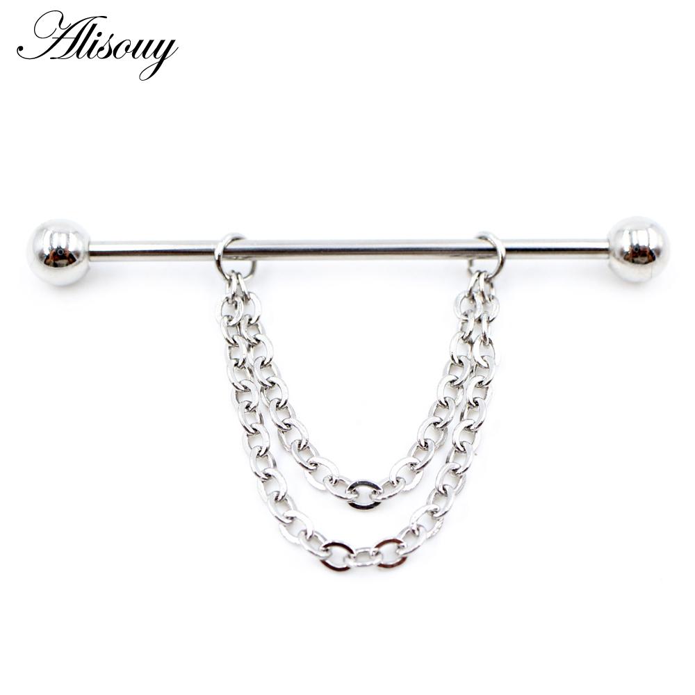 Alisouy 2PCS Круглая Цепочка Шариков Длинная Нержавеющая Сталь Промышленная Штанга Серьги Для Хряща Уха Прямые Серьги-Шпильки Пирсинг Украшения Для Тела
