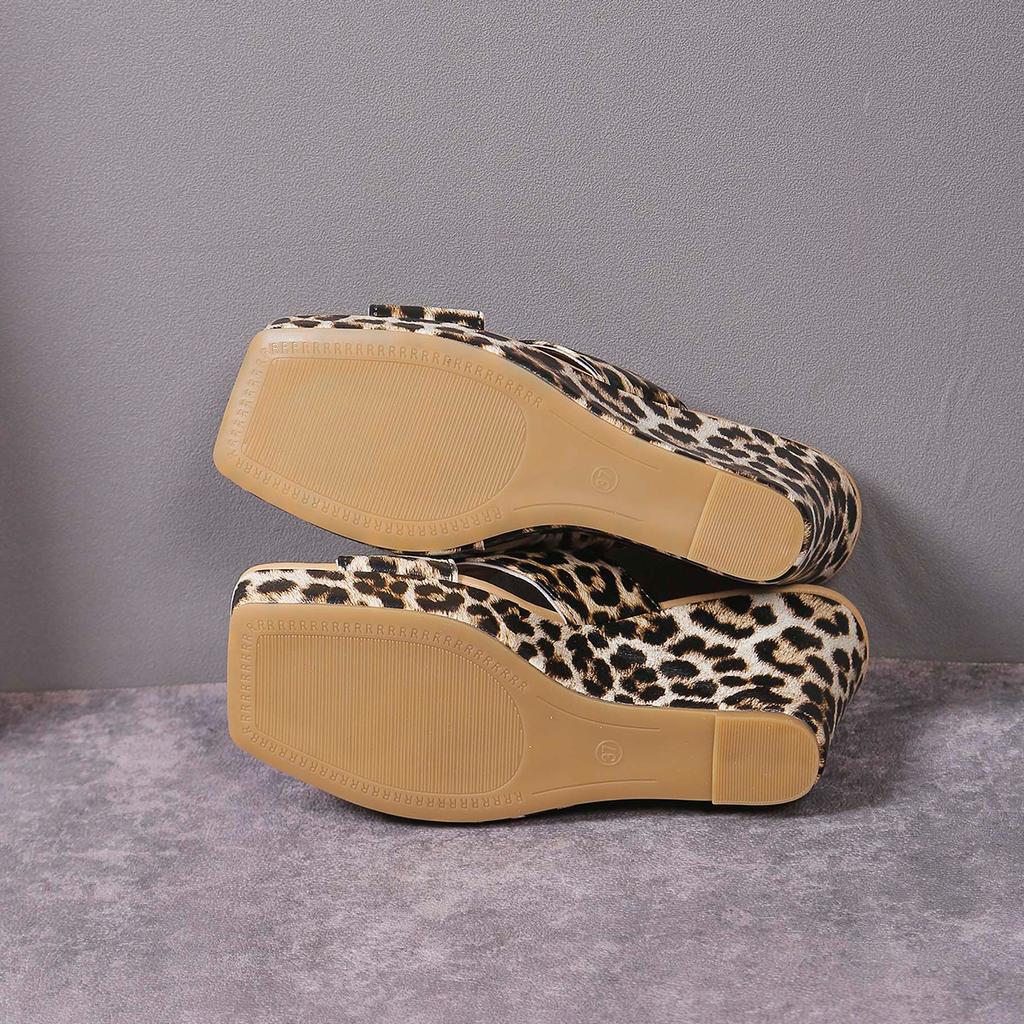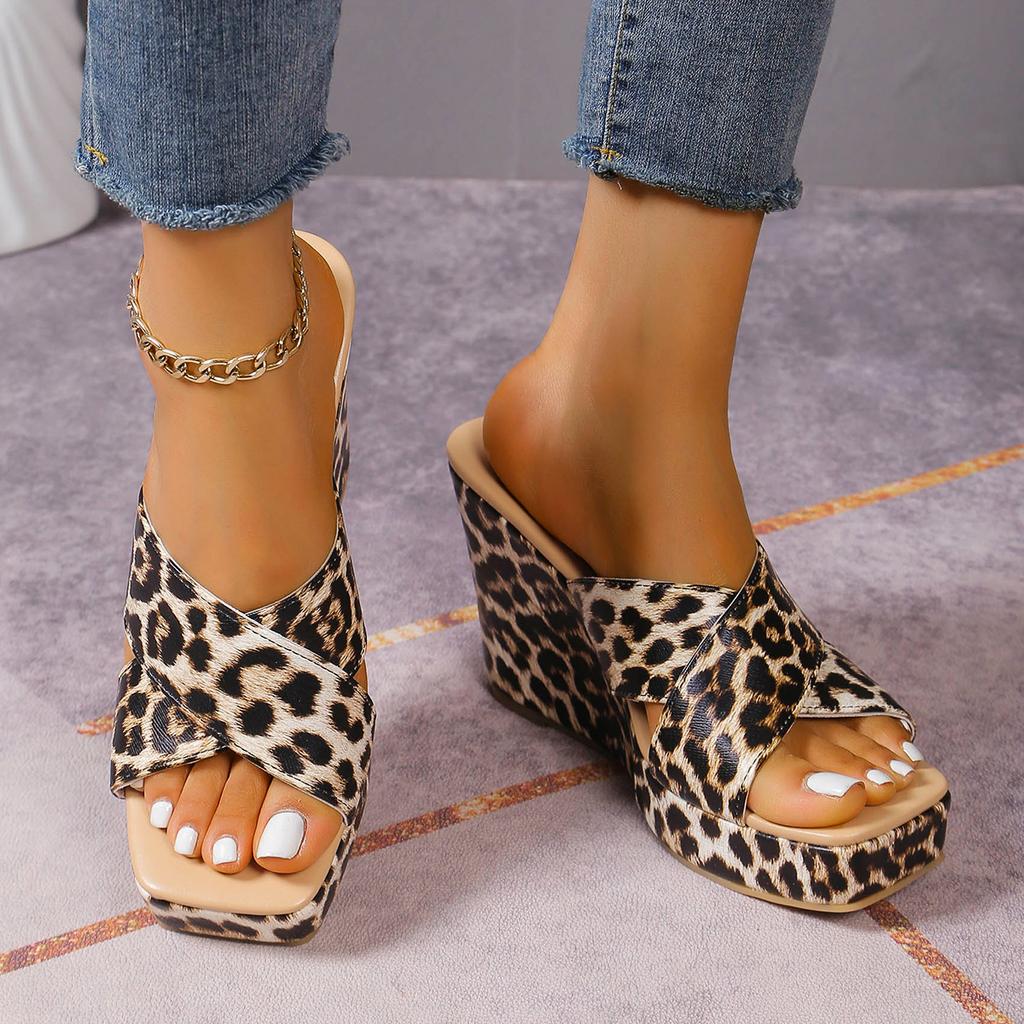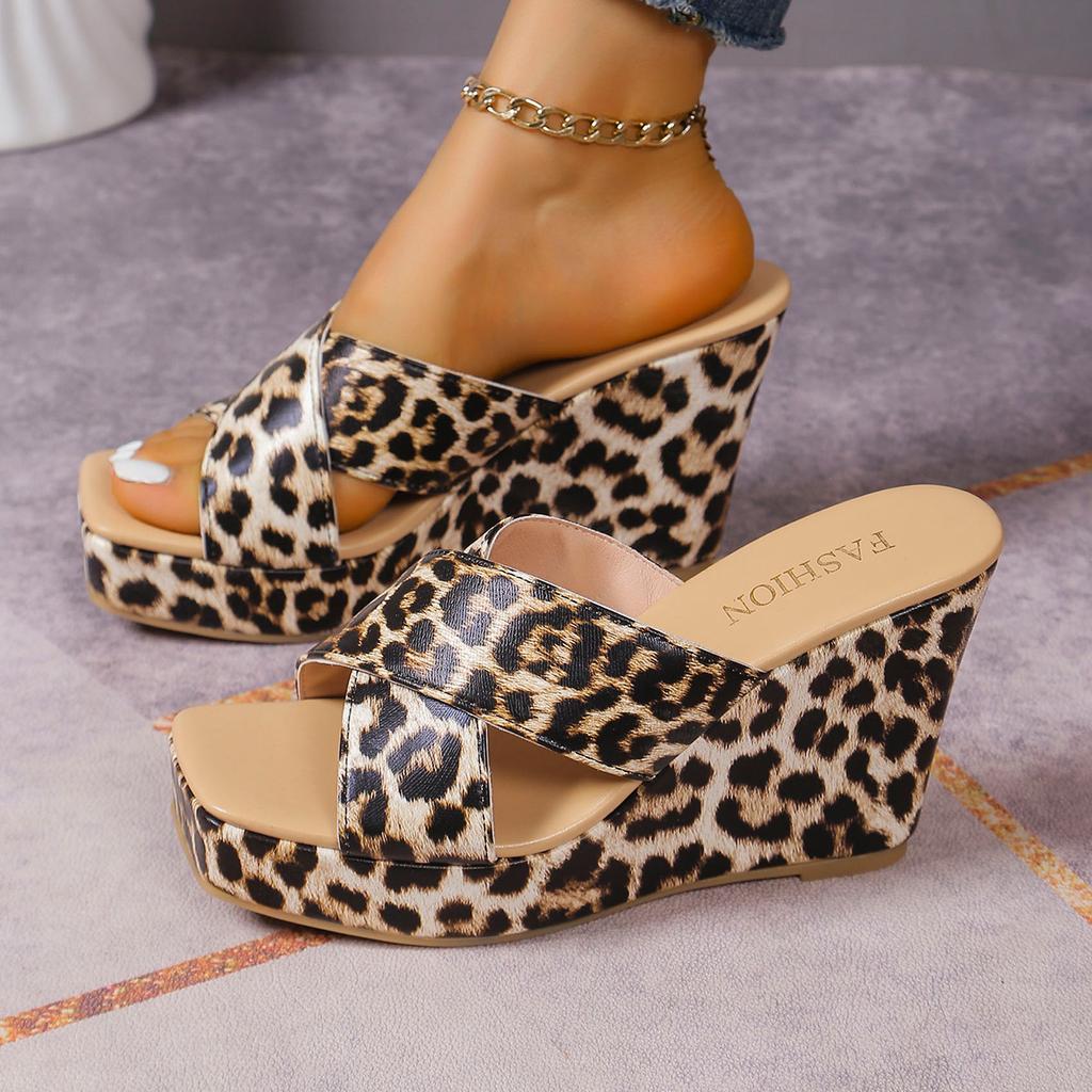 Летние новые тапочки на танкетке с широкими ремешками 2024 года для женщин с открытым носком на платформе с леопардовым принтом, пляжная обувь в римском стиле