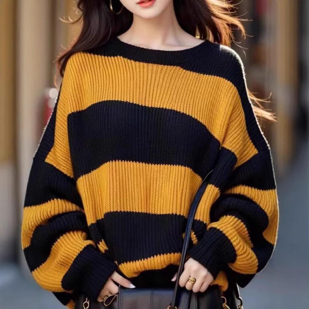 Свободный свитер в полоску с цветными блоками, женский свитер с длинными рукавами, вязаный свитер сверху