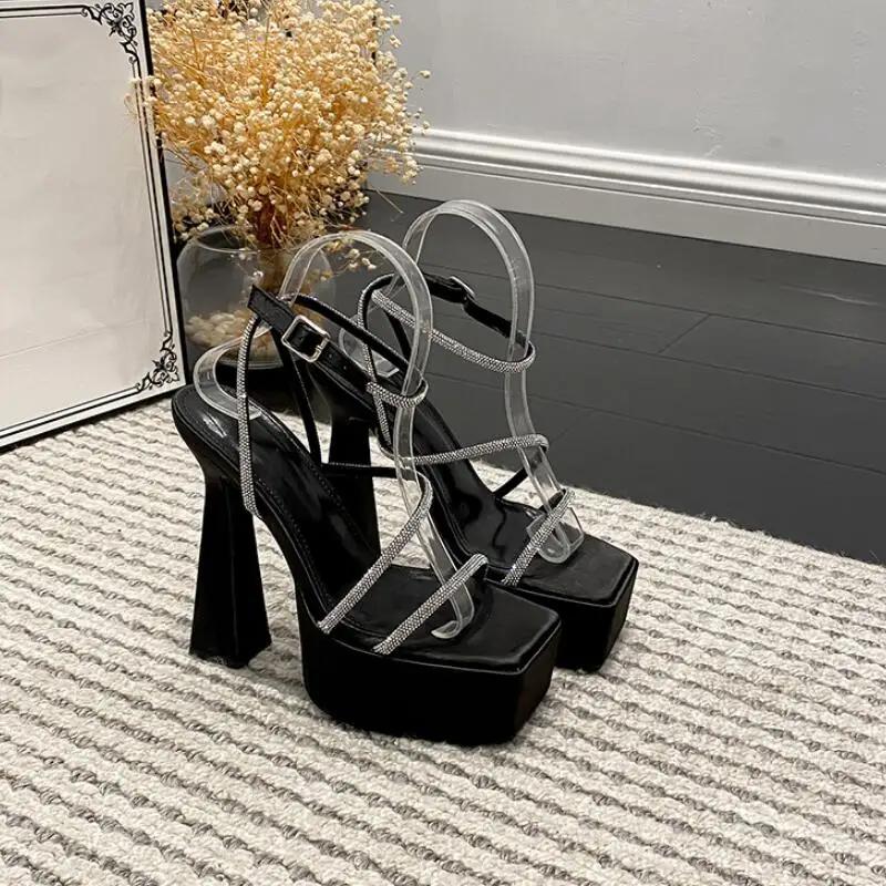 Сексуальные босоножки на тонком ремешке с кристаллами и стразами, женские, на водонепроницаемой платформе 5 см, с квадратным носком, на толстом высоком каблуке 15 см, обувь для вечеринок