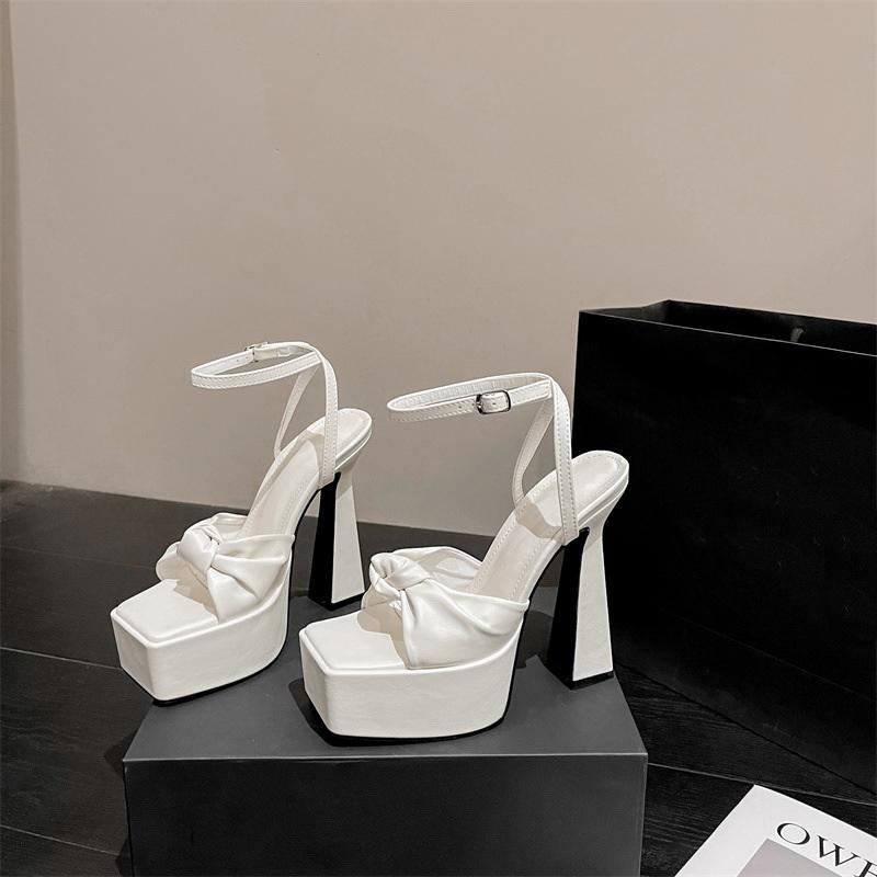 Новые сандалии с квадратным носком, плиссированной кожей и бантом-бабочкой для женщин, банкетная вечеринка, туфли на высоком каблуке, ремешок с пряжкой на щиколотке, платформа