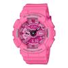 The CASIO G-SHOCK GMA-S110ST-4AJF features a unique design expressing the texture of silk, with a gentle luster of iridescent pearl that changes appearance depending on the angle of light. The bezel and band are coated with iridescent pearl and finished with a matte polish, showcasing an elegant silk texture. This watch is available in three colors—white, blue, and pink—making it easy to coordinate, and features a unique face with a mix of complex shaped parts complemented by a bright metallic color. The main materials used are biomass plastic, which helps reduce environmental impact.