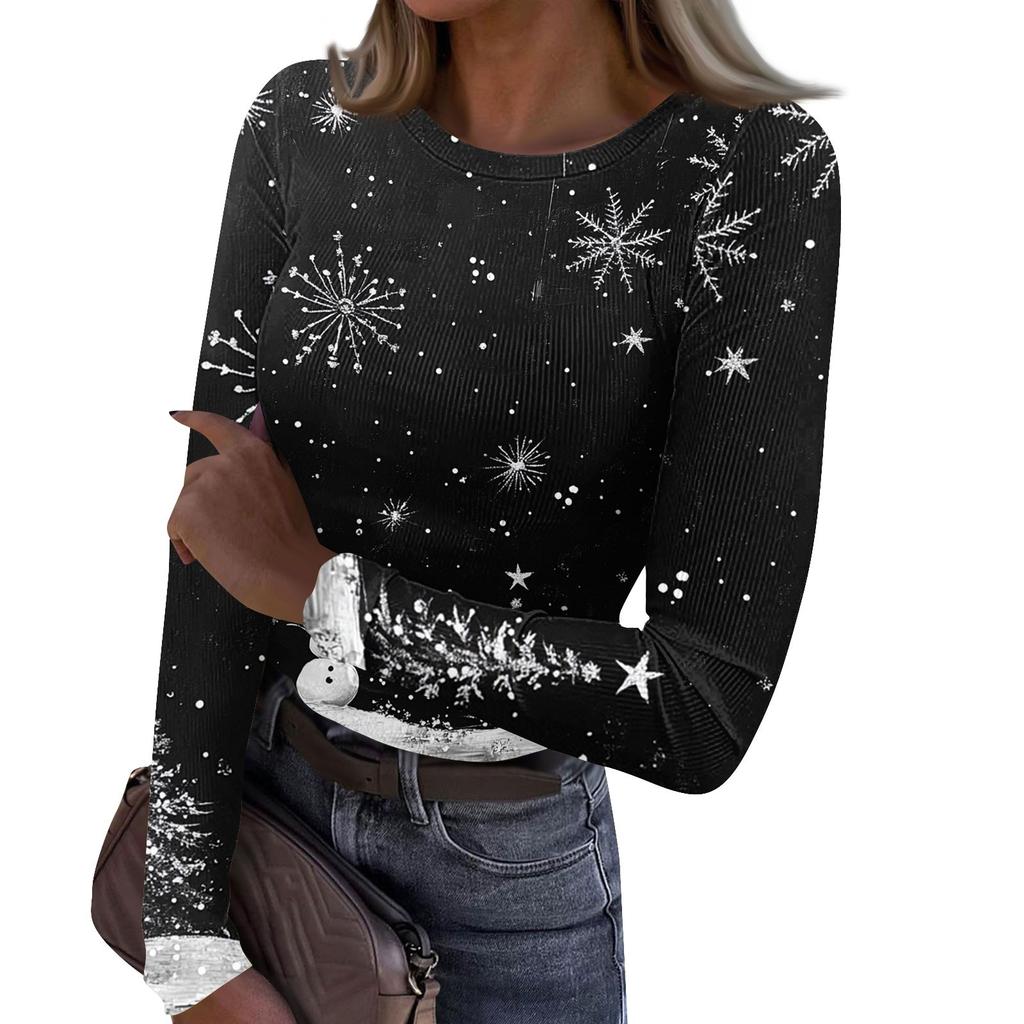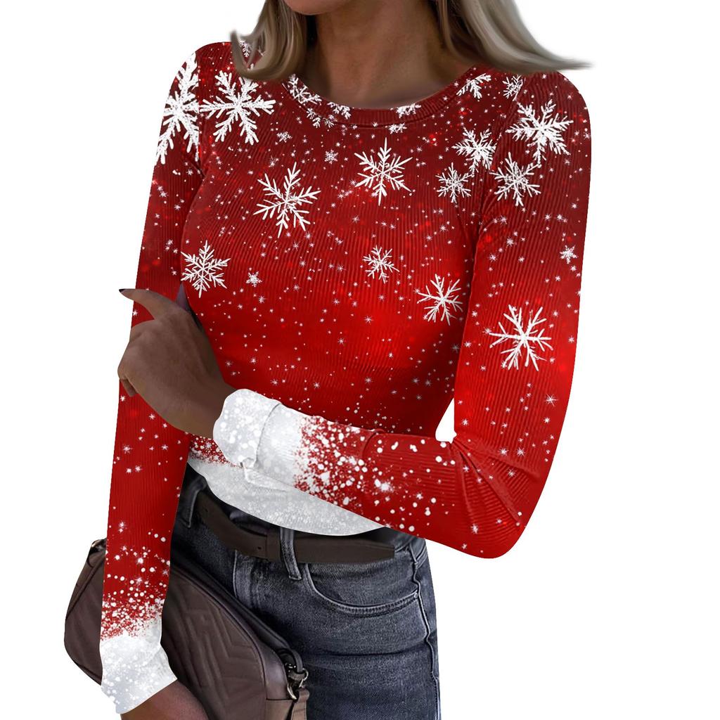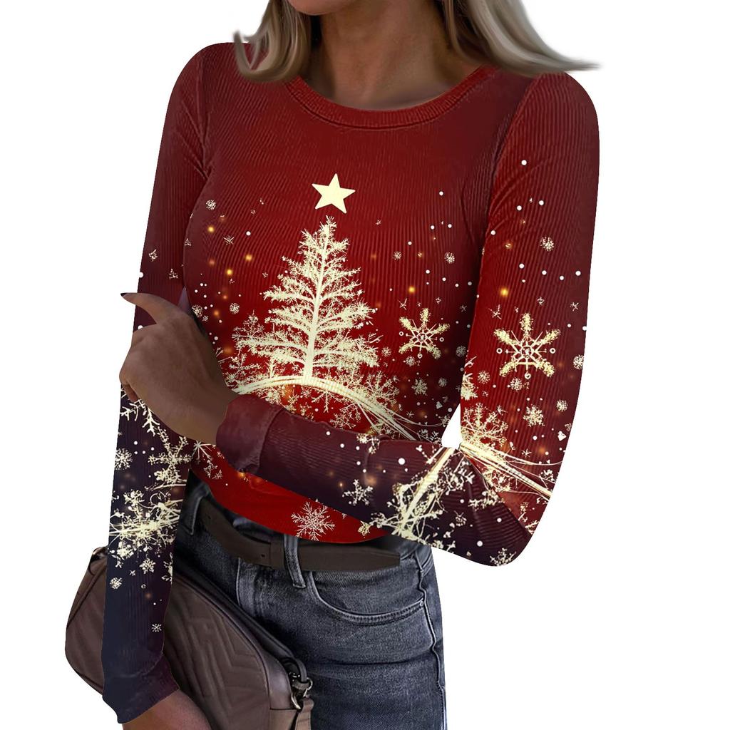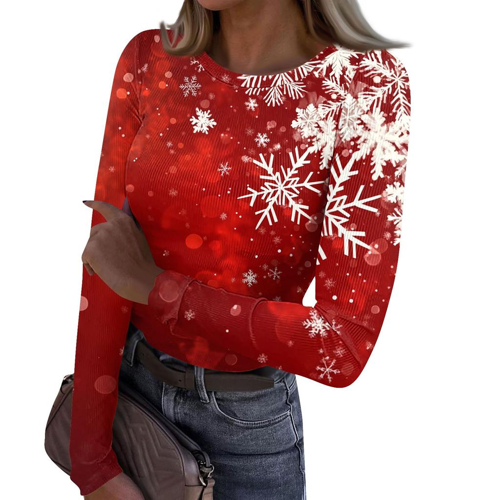 Женская и зимняя футболка с тонким низом, модная повседневная футболка с рождественским принтом и круглым вырезом, длинный рукав