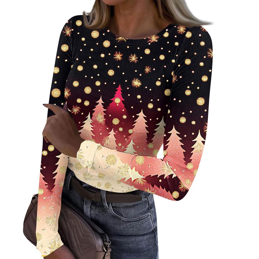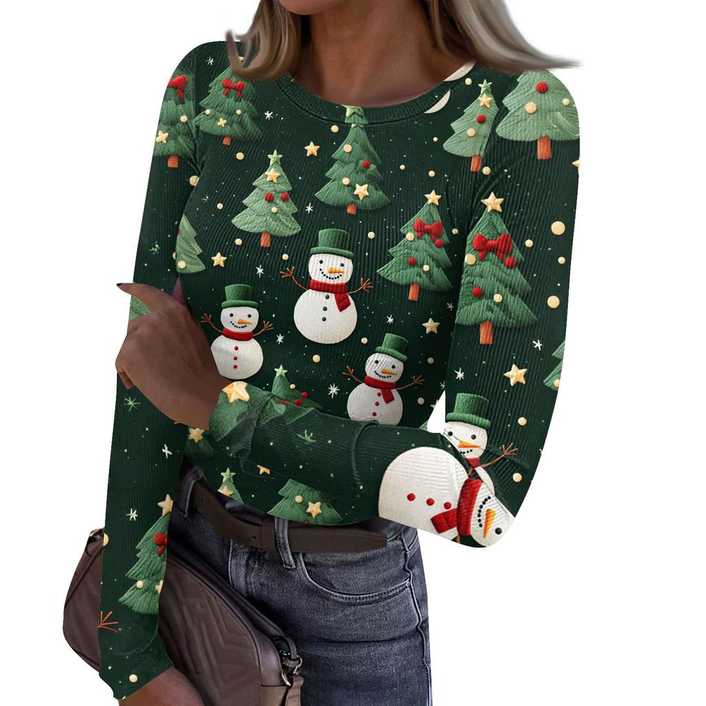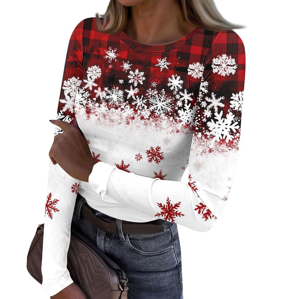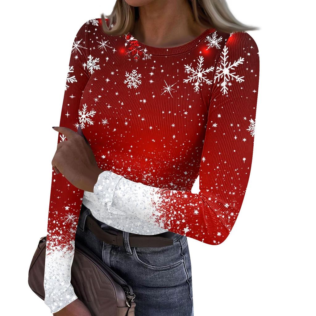 Женская и зимняя футболка с тонким низом, модная повседневная футболка с рождественским принтом и круглым вырезом, длинный рукав