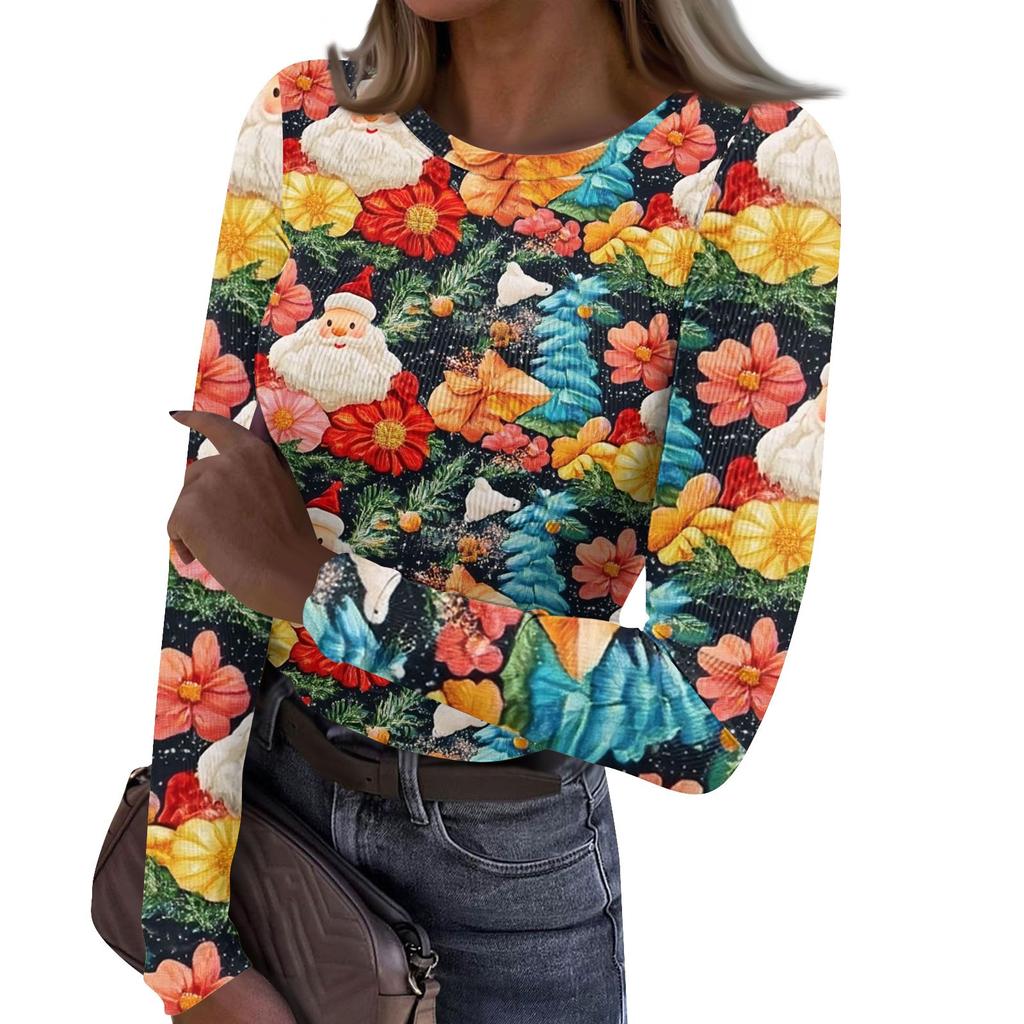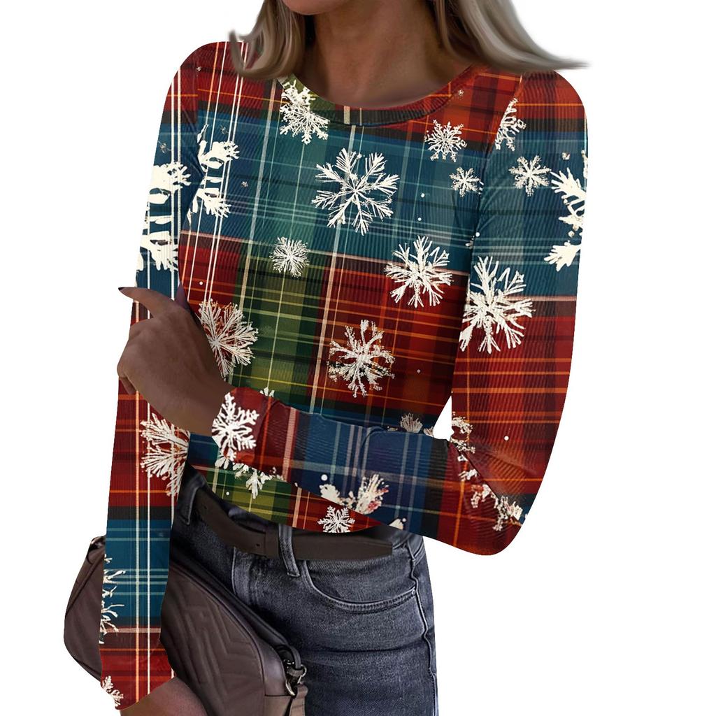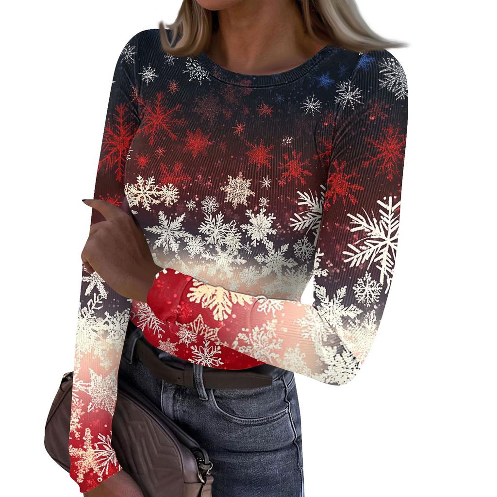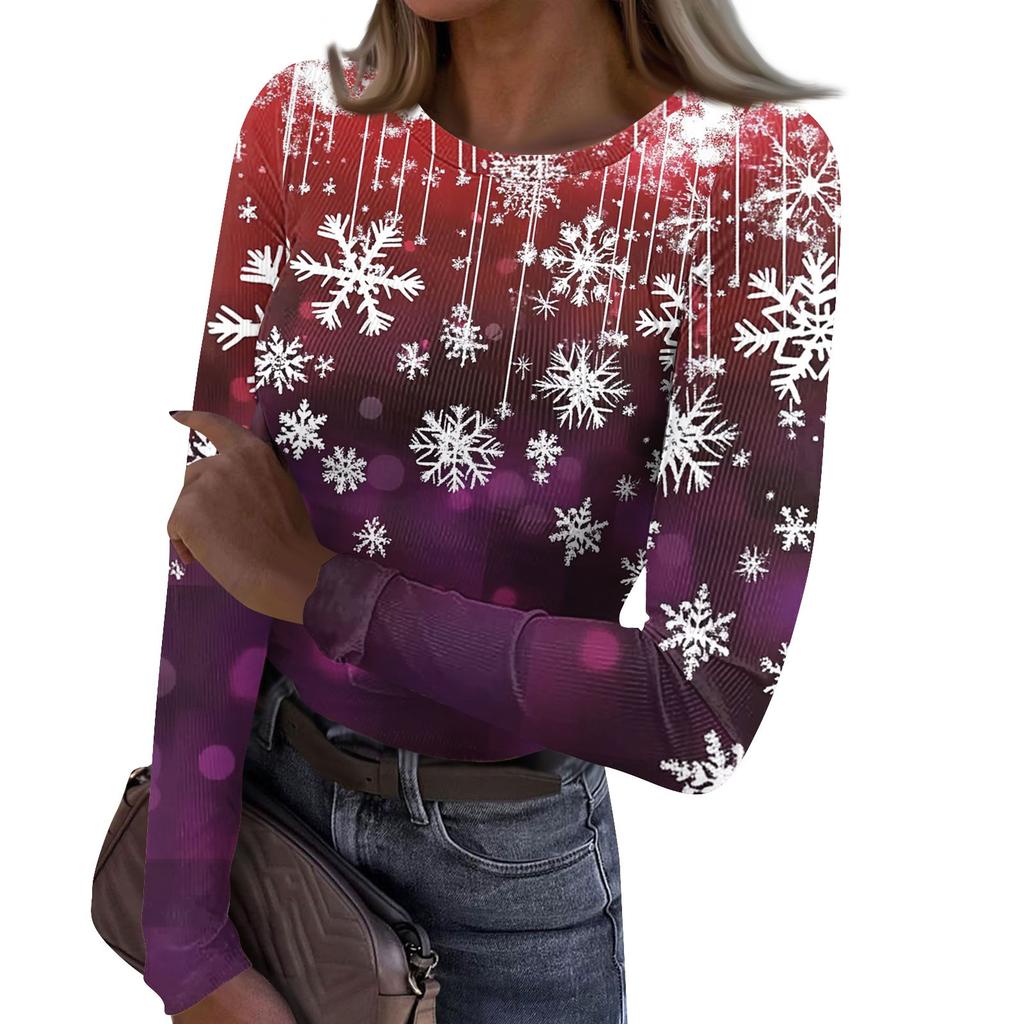 Женская и зимняя футболка с тонким низом, модная повседневная футболка с рождественским принтом и круглым вырезом, длинный рукав