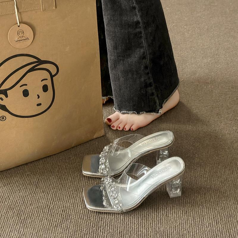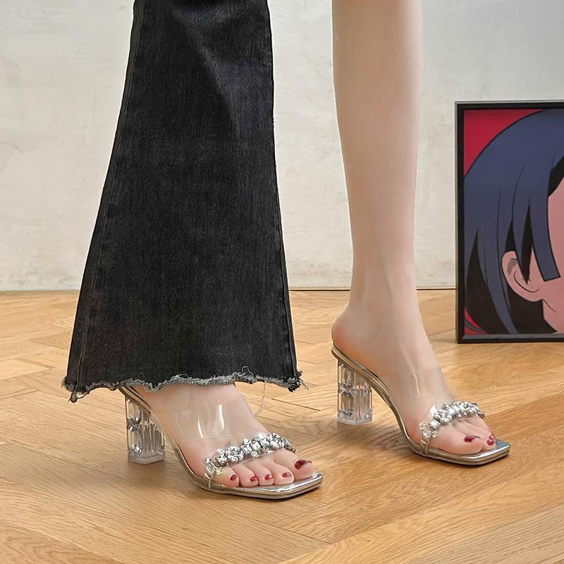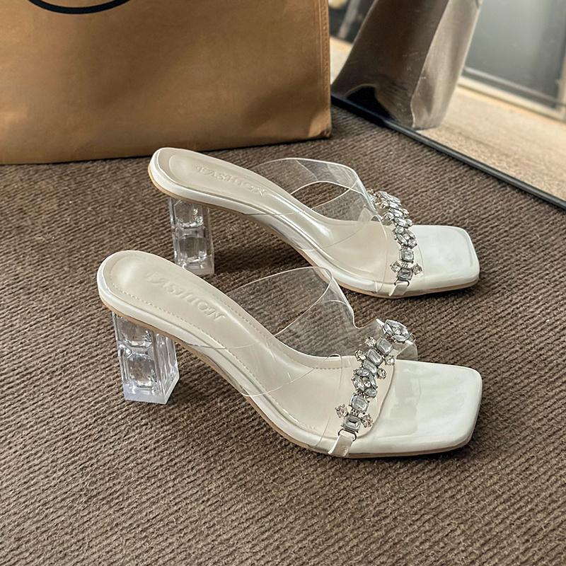 Новые летние сандалии для женщин, модные тапочки с квадратной головкой и неглубоким горлом, со стразами, прозрачные, со словами темперамента и кристаллами