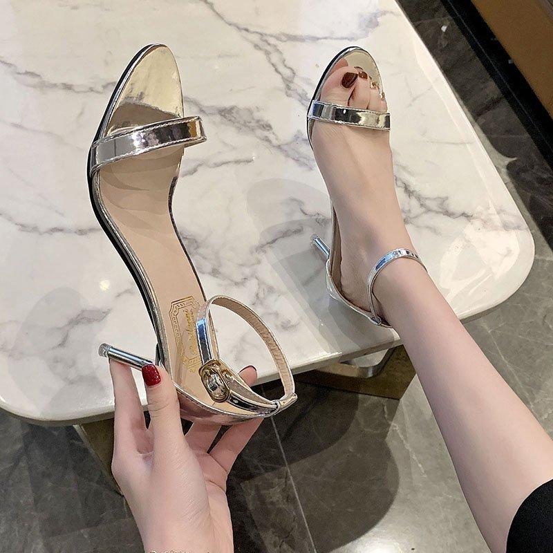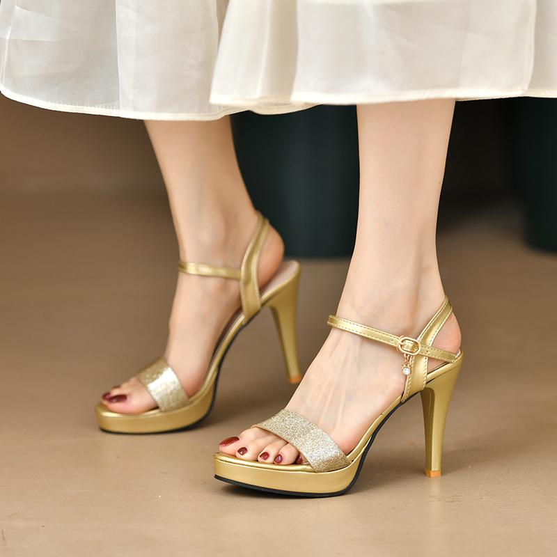 Летние новые женские босоножки с открытым носком и пряжкой на высоком каблуке, модные туфли золотисто-серебристого цвета, большие размеры, сексуальные римские босоножки с пайетками, женские