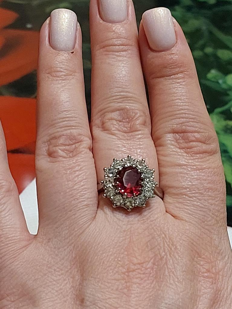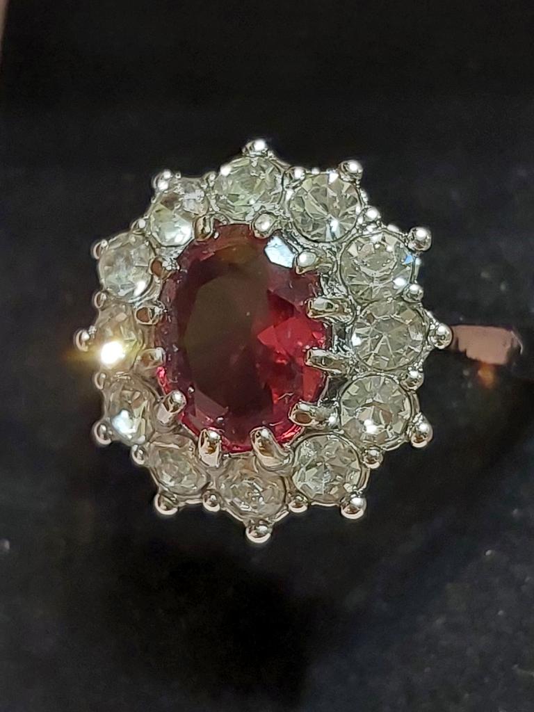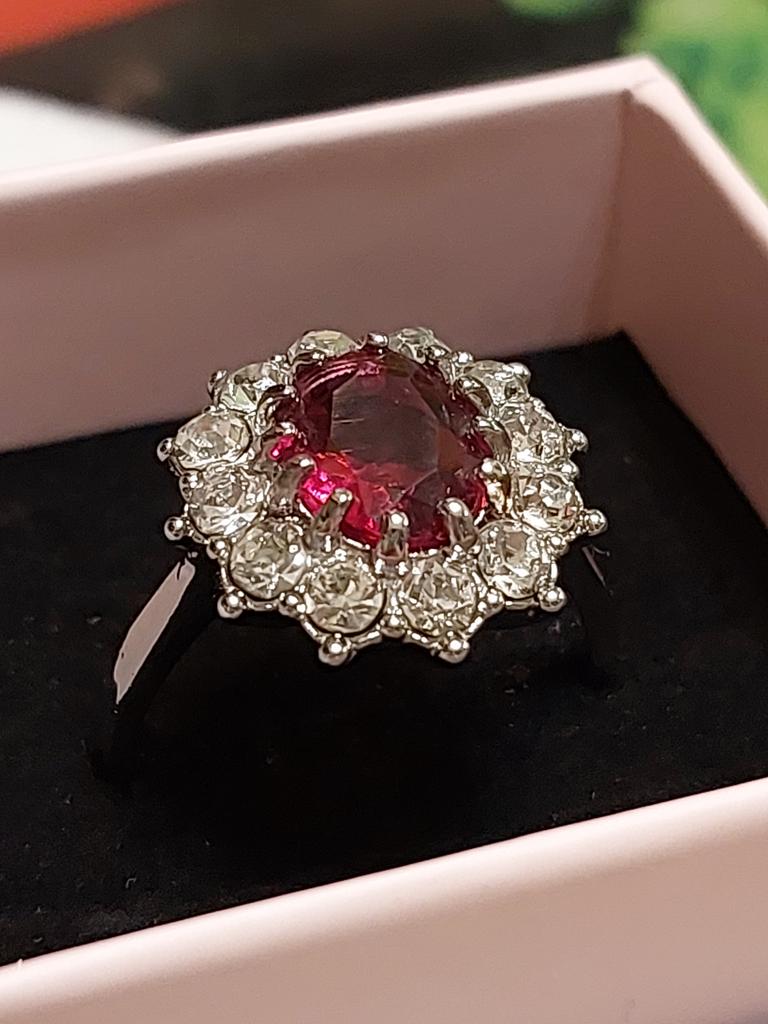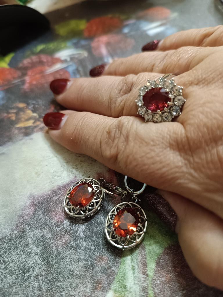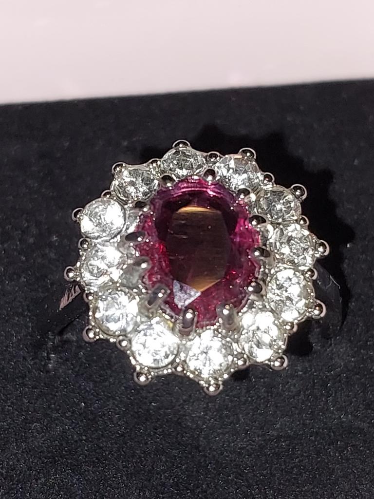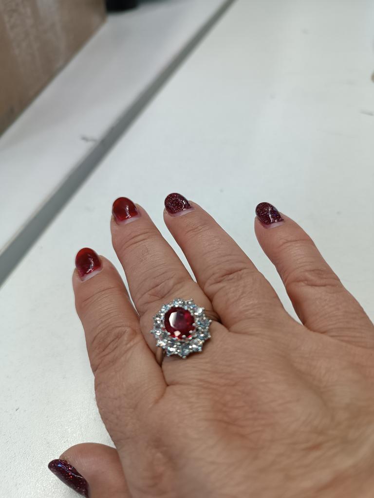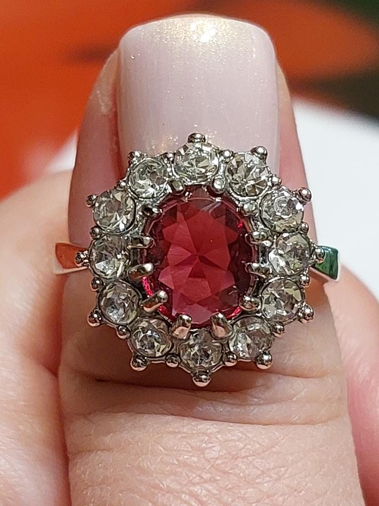 Очень красивый перстенек с камнем малинового цвета.Очень аккуратная работа.Все камешки хорошо закреплены усиками.Размер кольца соответствует заказанному.Размер центрального камня - 1,0 × 0,8 см.Размер кольца - 1,8 × 1,6 см.Очень красиво смотрится на руке,камешки переливаются на свету.Очень довольна покупкой.
