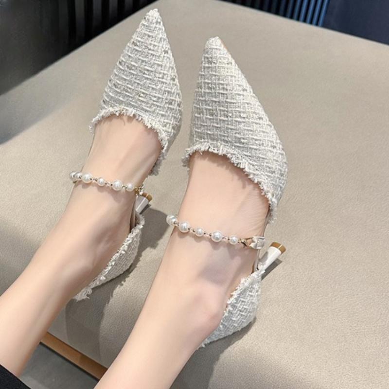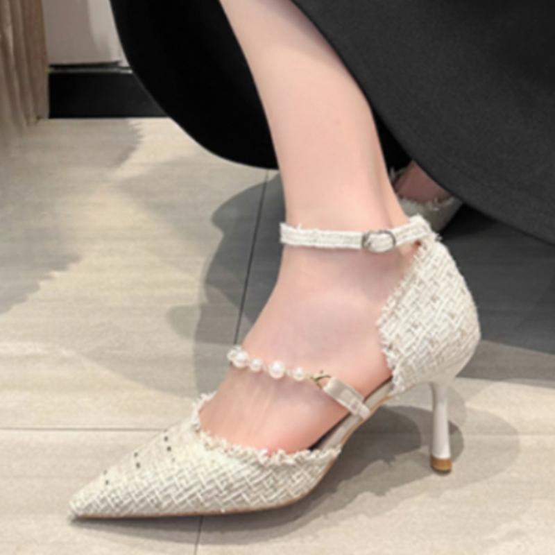 Новые туфли на тонком каблуке из ткани с полым жемчугом на высоком каблуке, женские сексуальные повседневные весенне-летние рабочие туфли для поездок на работу, сандалии женские