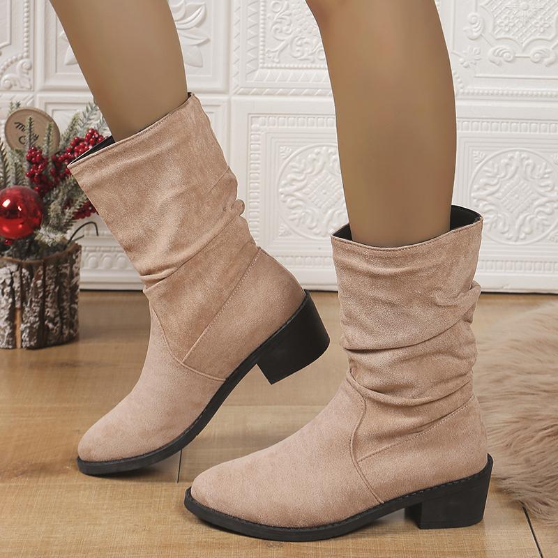 Обувь для женщин 2024 года, брендовые женские сапоги без застежек, осенние сапоги с круглым носком из цельного флиса, плиссированные, на толстом каблуке, в стиле ретро в римском стиле до середины голени