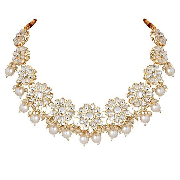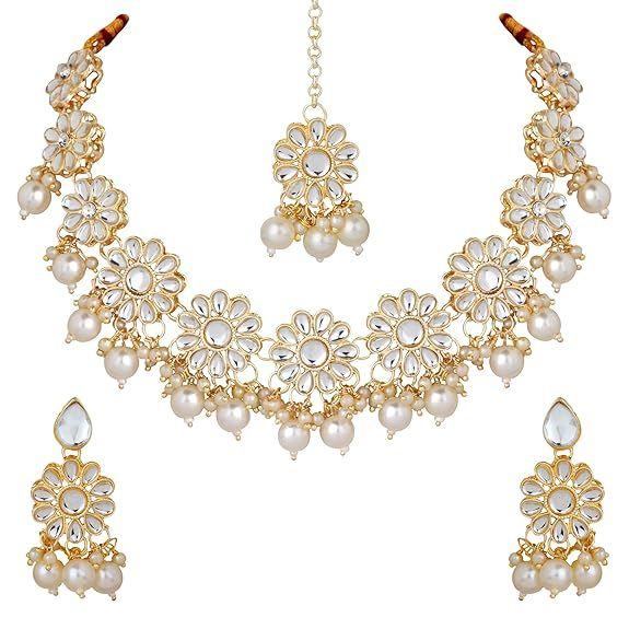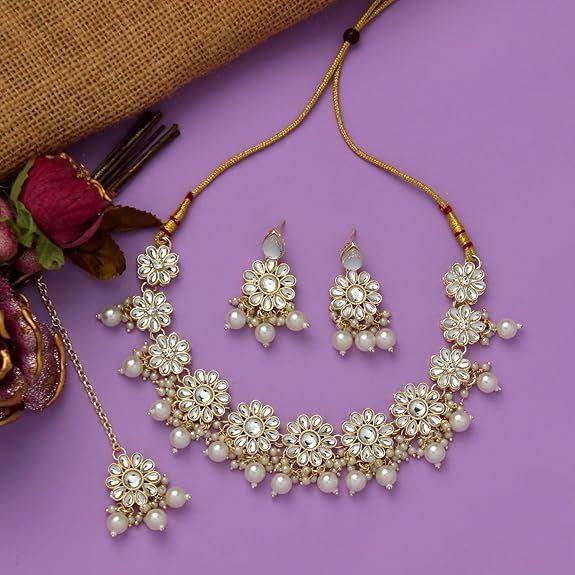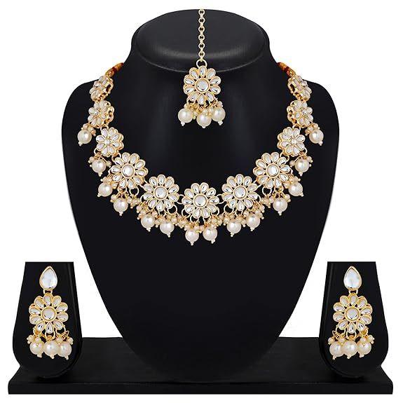 Традиционный комплект ожерелий из белого жемчуга Kundan | Чокер Kundan | Необычные украшения с серьгами и Maang Tikka для женщин и девочек