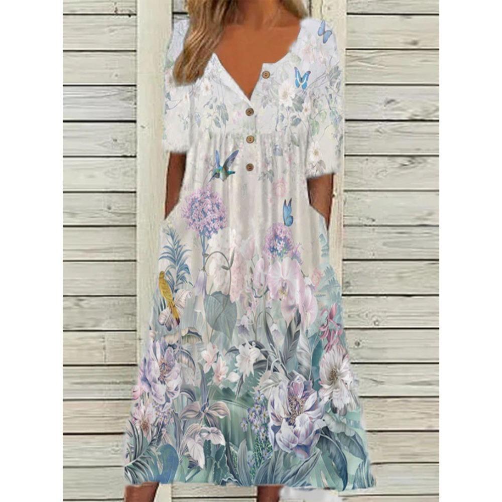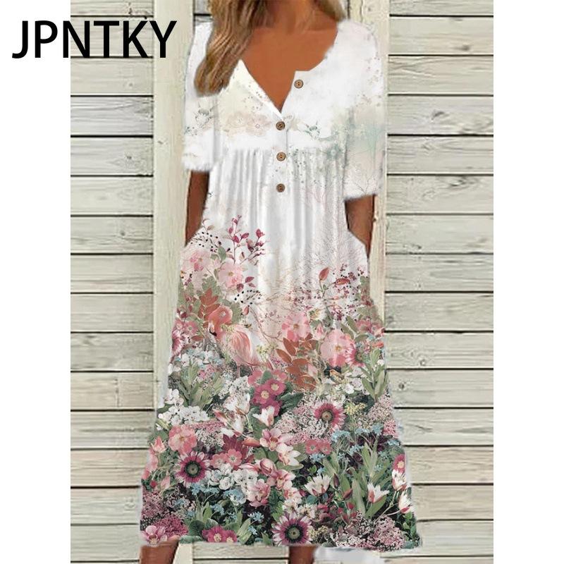 JPNTKY Женская мода Лето Весна Цветочный принт Короткие рукава V-образный вырез Повседневные платья