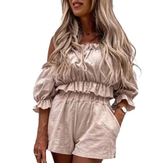 Стильный дизайн: Этот комплект шорт отличается вырезом с открытыми плечами, рукавами-буфами с рюшами и деревянными ушками на поясе, что придает ему модный и модный вид.
