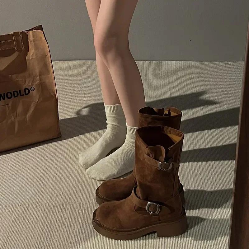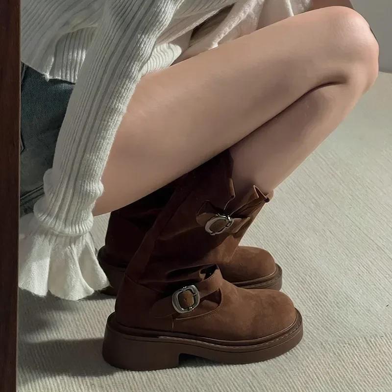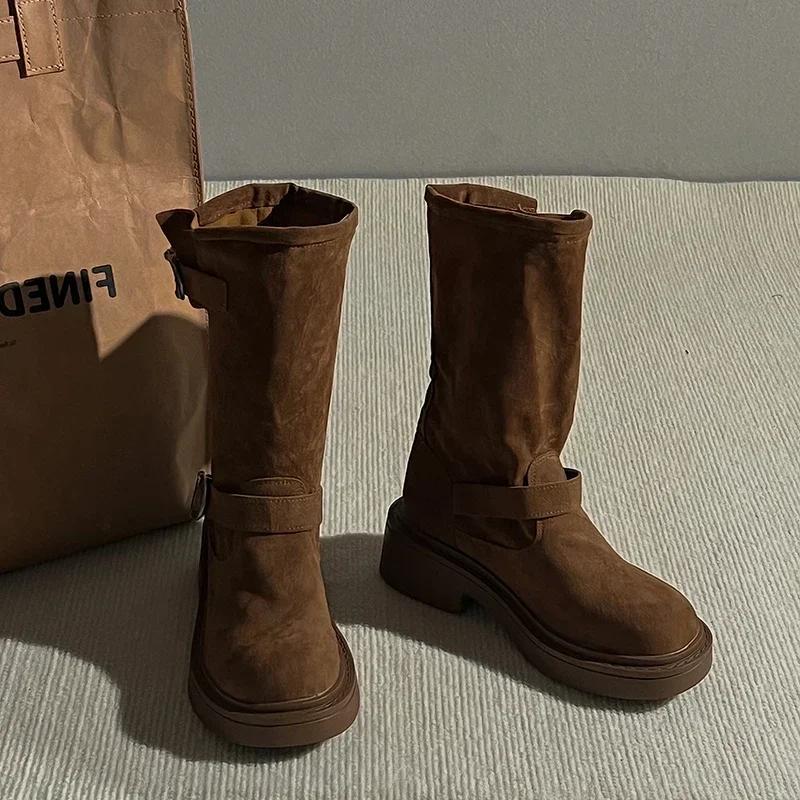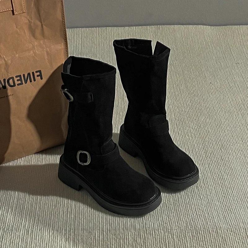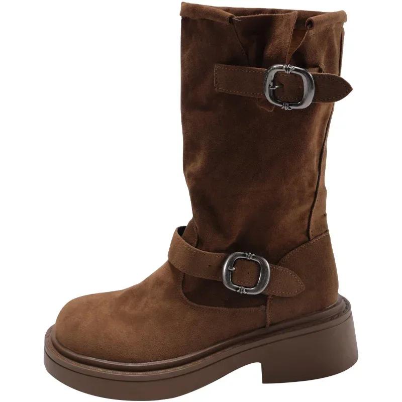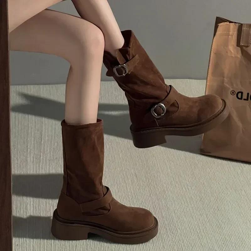 Винтажные женские ковбойские сапоги в стиле вестерн, модные туфли с пряжкой на поясе, осенне-зимние женские полусапожки на толстом каблуке до середины голени