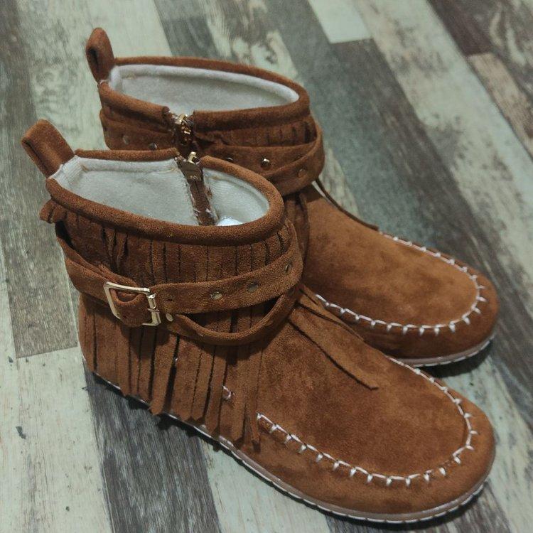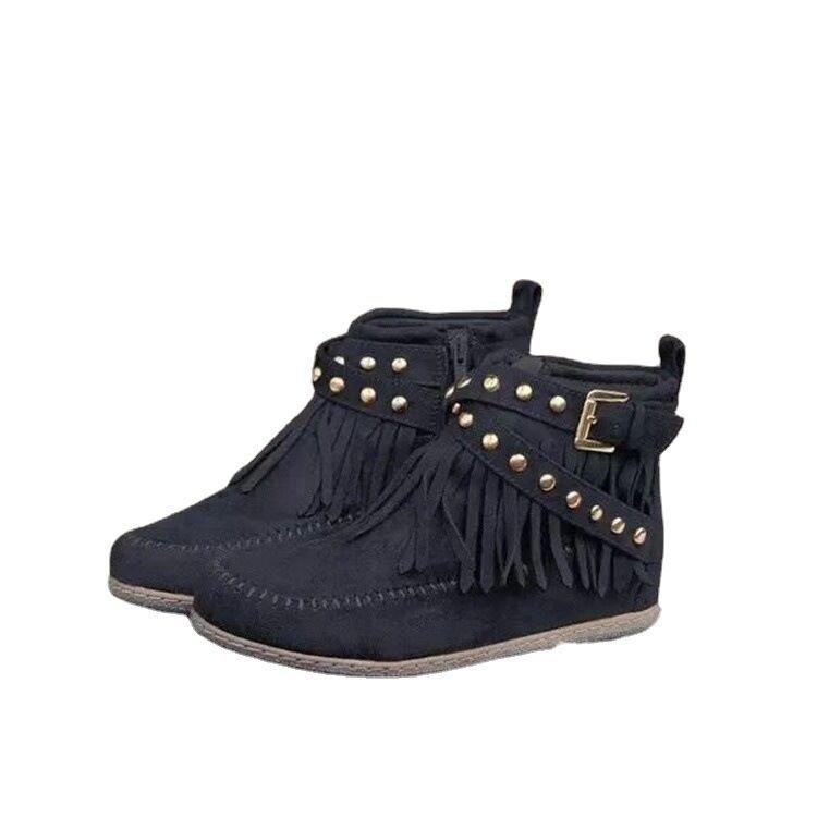 Женские ботинки в стиле ретро с кисточками, застежкой-молнией сбоку, заклепками, короткие ботинки 2024 года, зимние новые туфли на плоской подошве, удобные нескользящие замшевые ботильоны с круглым носком