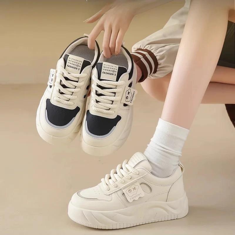 Женские кожаные балетки Весна Новая мода Нескользящие Спортивные Уличные Мягкая подошва Студенческие На толстой подошве Повседневные Молочно-белые Кроссовки