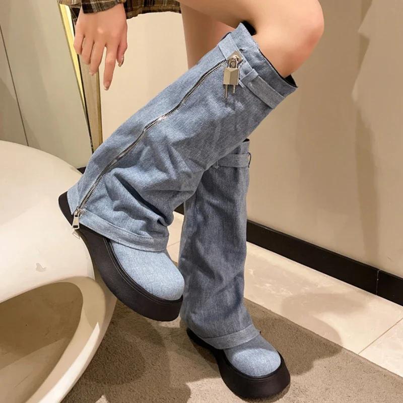 Плиссированные синие джинсовые высокие женские туфли на толстом каблуке в ковбойском стиле слипоны на платформе Western с длинной молнией Botas De Mujer Goth