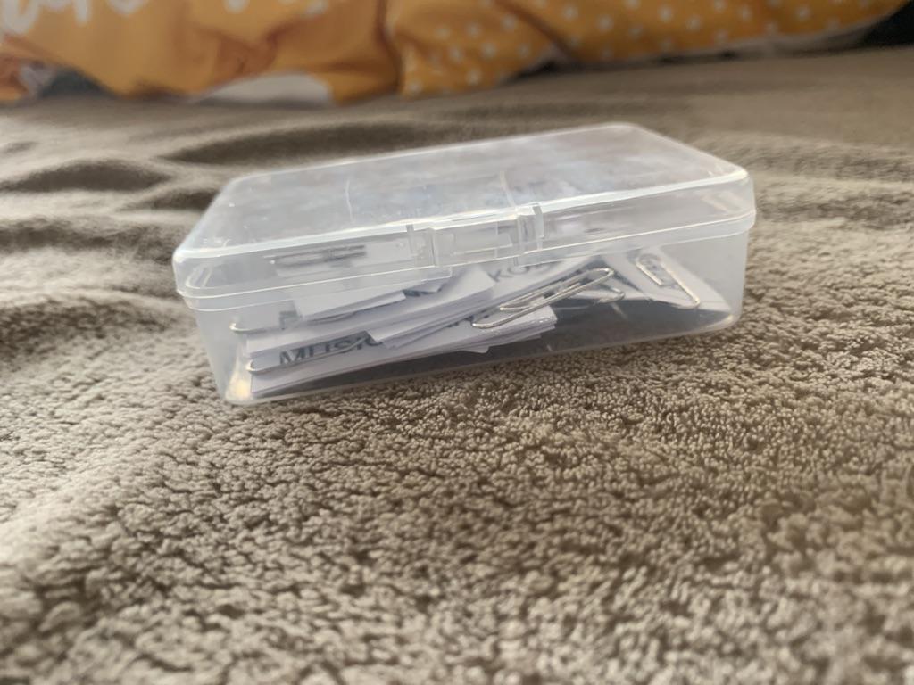Коробочка целая. Пластик прозрачный. Есть петелька сбоку, можно повесить куда-нибудь.