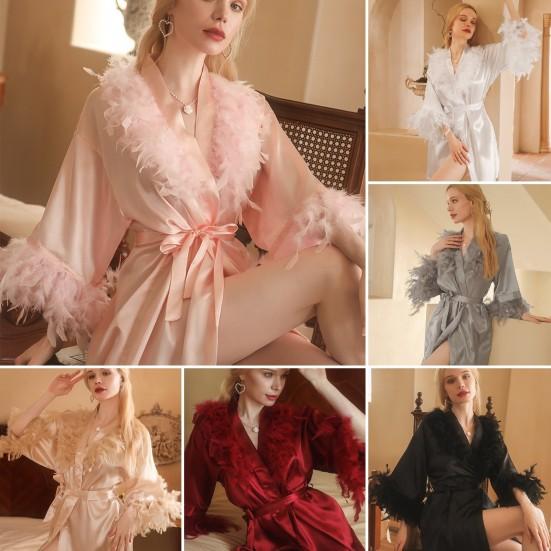 Женская ночная рубашка с перьями, регулируемый пояс, атласный V-образный вырез, имитация шелка, однотонная пижама, вечеринка, свадьба, невеста, подружка невесты, утренний халат