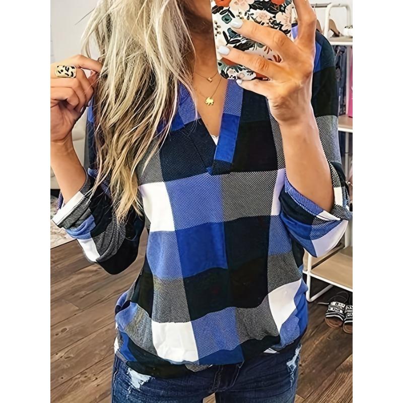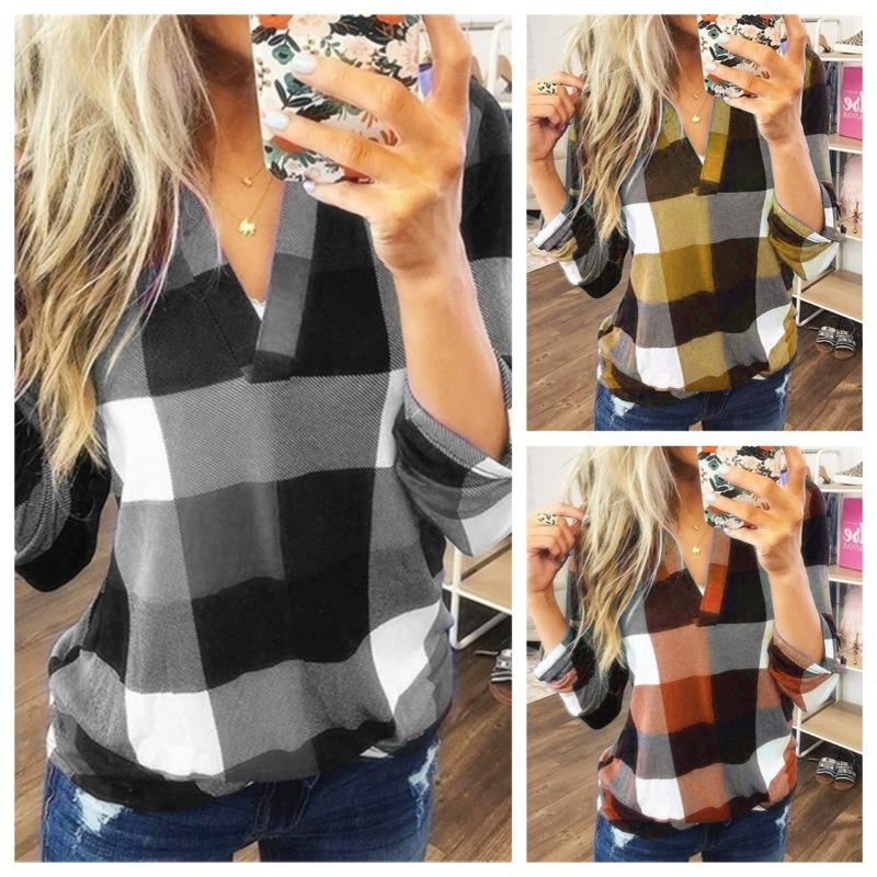 Женские блузки в стиле весна-осень, рубашки, повседневные блузки с длинным рукавом и V-образным вырезом в клетку с принтом, топы