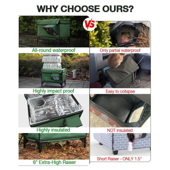 Безопасное решение для отопления: Оборудован ковриком для обогрева домашних животных, который включает в себя множество функций безопасности, таких как безопасный нагревательный провод, водонепроницаемая оболочка из ПВХ, двойная защита термостата и провод против укусов длиной 62 дюйма.. Наши отапливаемые домики для кошек на открытом воздухе обеспечат вашему котику комфортное тепло даже при низких температурах.