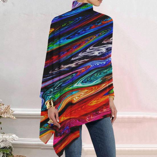 Осень-весна женский топ с красочным художественным принтом, высокий воротник, свободный неровный подол, длинный рукав, пуловер средней длины, мягкая цветная повседневная женская блузка
