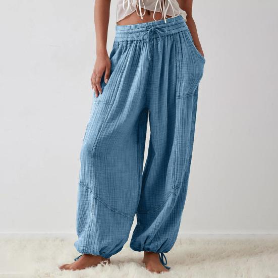 Стильные детали: Эти однотонные брюки со шнуровкой и эластичным поясом создают классическую, но модную атмосферу.