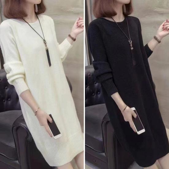 Женское платье-свитер с круглым вырезом, вязаное однотонное свободное эластичное платье с длинными рукавами и толстым теплым пуловером длиной до середины икры, женское осеннее платье миди — купить товар онлайн с бесплатной доставкой до всему миру!
