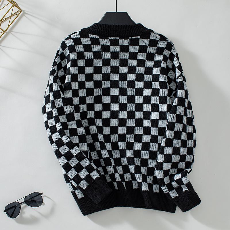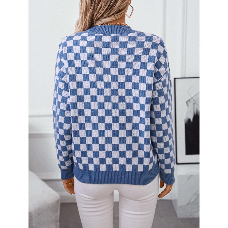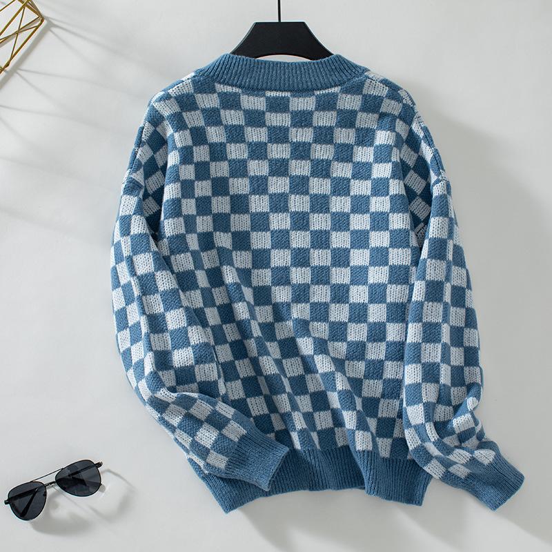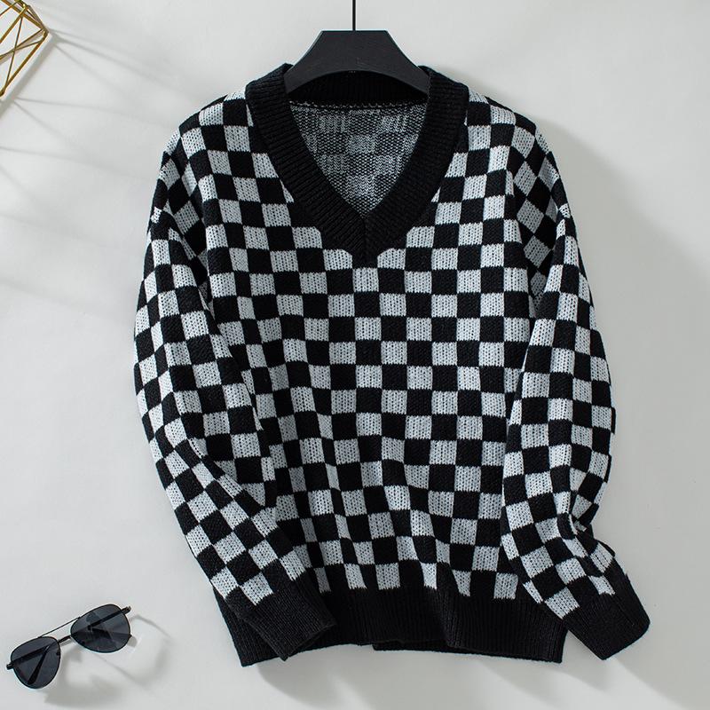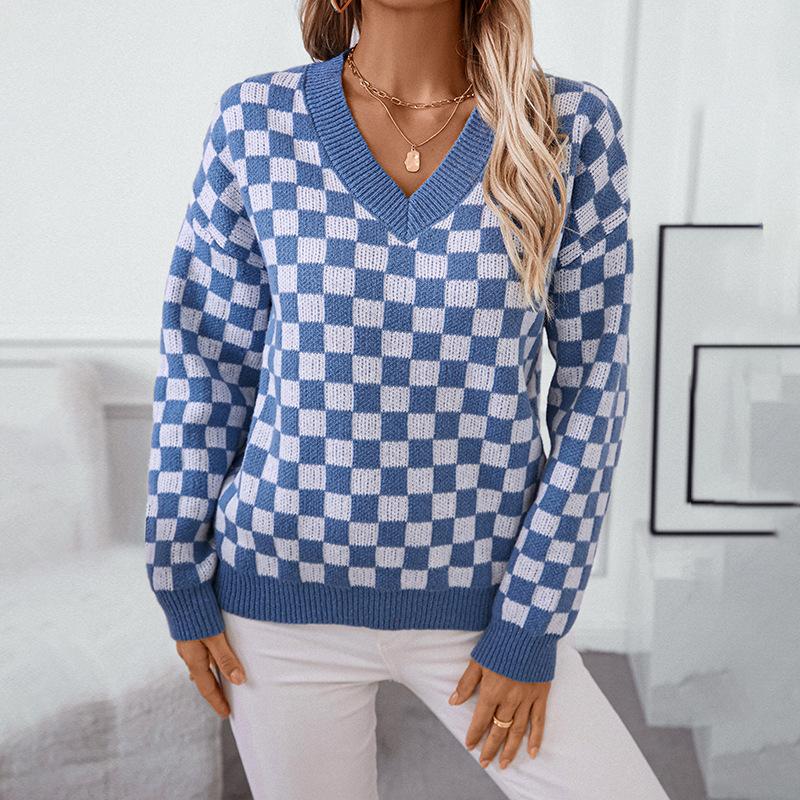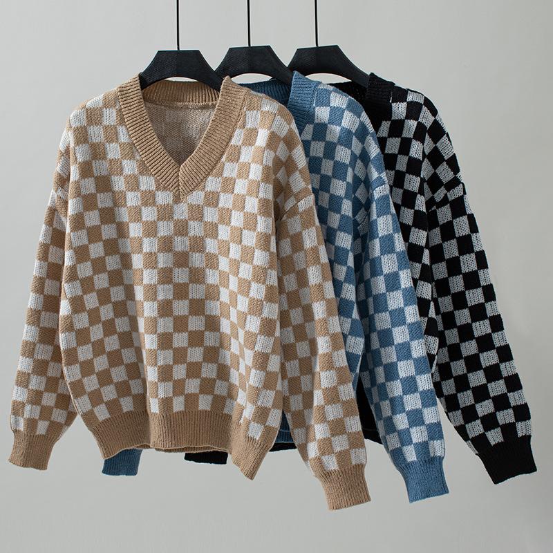 Женский свитер с V-образным вырезом, осень/зима, свободный пуловер, клетчатый свитер с цветовыми блоками