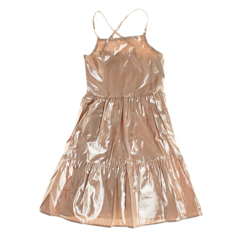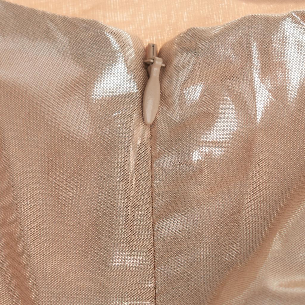 Платье выполнено из блестящего атласного материала и оснащено регулируемыми бретельками-спагетти, которые перекрещиваются на спине, что обеспечивает индивидуальную удобную посадку.