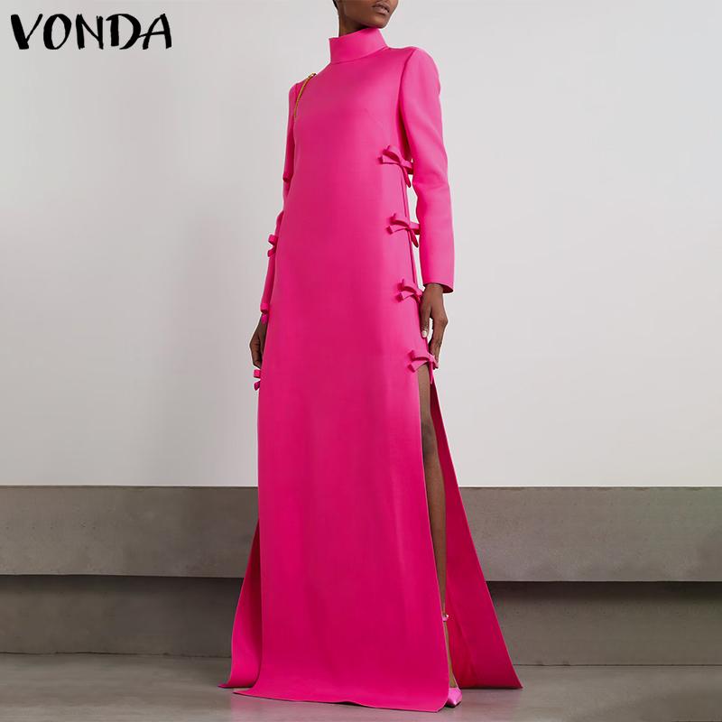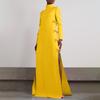 Характеристики:Длинное платье с высоким воротом, разрезом и бантом, однотонное, с длинными рукавами