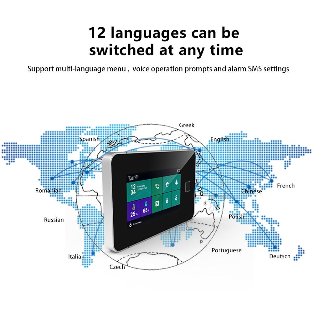 [Удаленное управление и мониторинг]: С помощью удобного приложения TY на вашем смартфоне вы можете удаленно управлять и контролировать вашу систему сигнализации в любое время и в любом месте.. Всего одним касанием вы можете включить аварийную сигнализацию, активировать оповещения о температуре и влажности и даже включить двустороннюю голосовую связь.. Система также поддерживает голосовое управление и предлагает выбор из 12 языков для удобства эксплуатации.