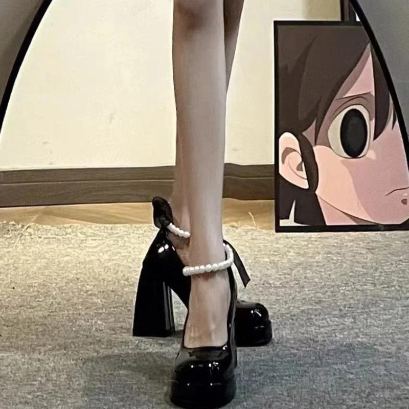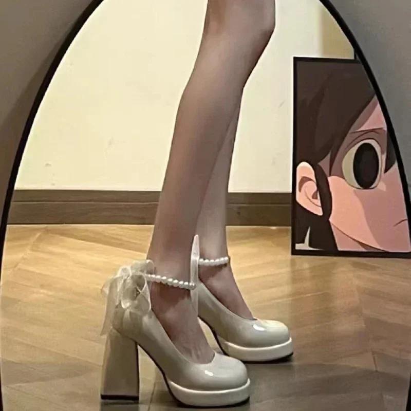 Мода Мода Женские туфли на высоком каблуке с элегантными бантами Женская обувь Вечеринка Квадратный носок Жемчужные сандалии Обувь на толстом каблуке для женщин Ретро Zapatos