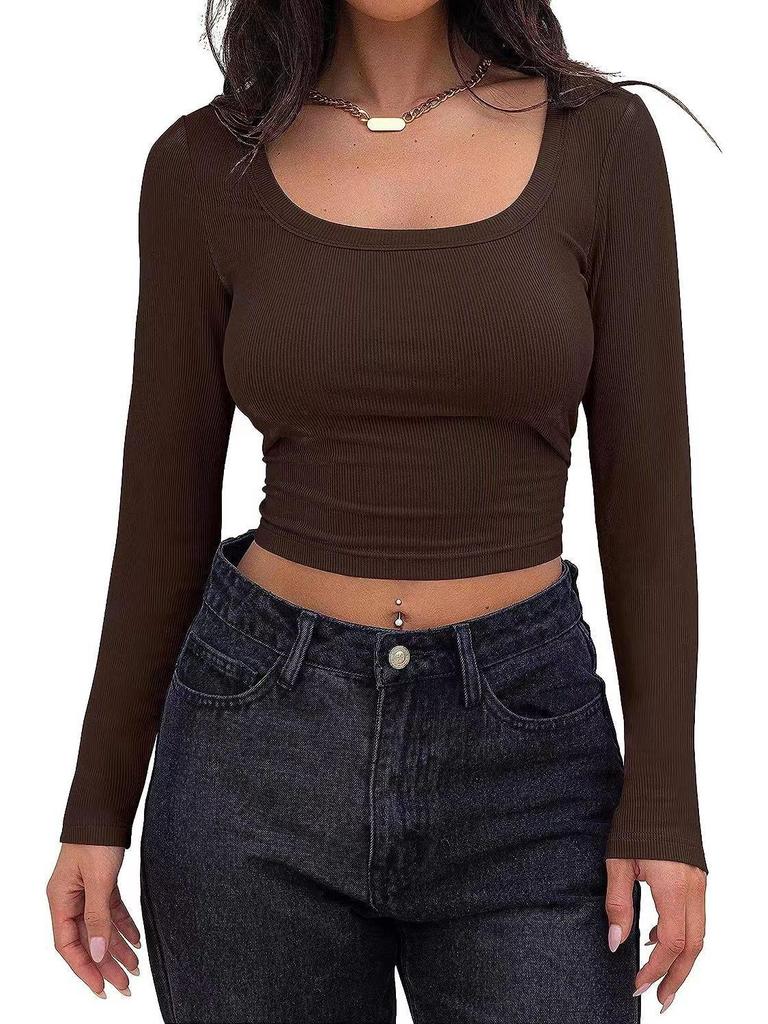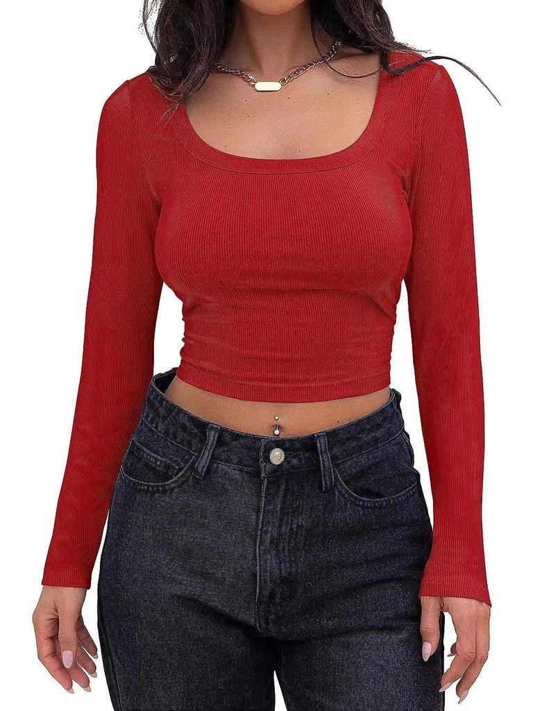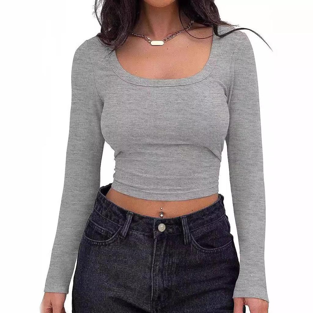 Новинка 2024 года, женская футболка в европейском и американском стиле с длинными рукавами и квадратным вырезом, облегающая