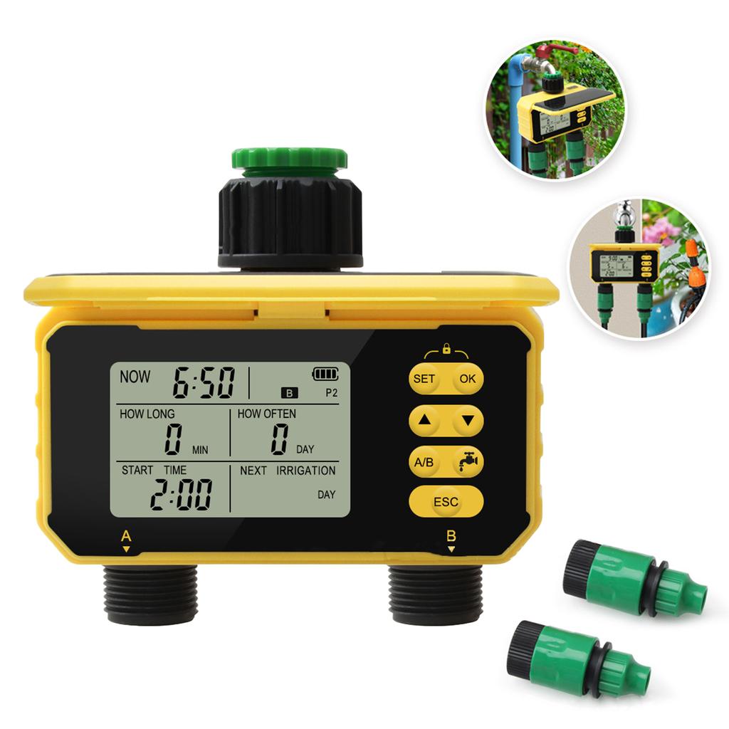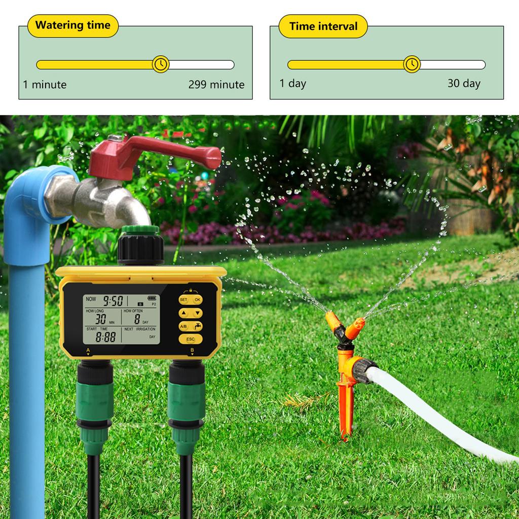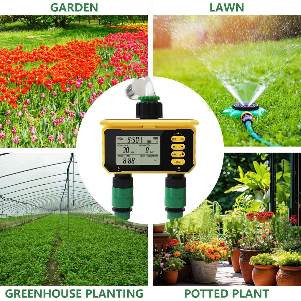 Измените свой уход за садом с помощью интеллектуального двойного таймера полива — автоматической системы синхронизации полива, которая обеспечивает точный полив, экономя воду и электроэнергию.,