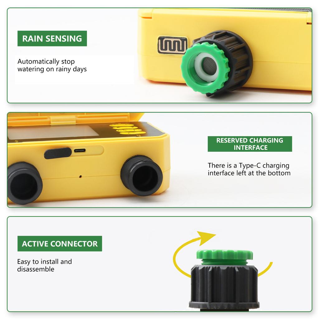 Воспользуйтесь экологически чистым управлением садом с помощью этого таймера полива на солнечной батарее, оснащенного функцией обнаружения осадков и блокировки экрана, что гарантирует процветание ваших растений в любых условиях.,