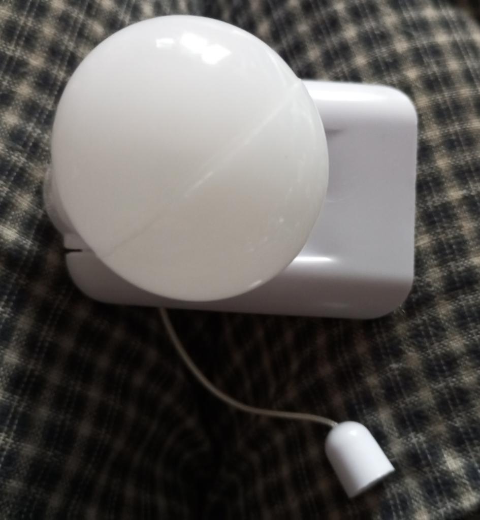 Давно искала такой небольшой светильник на стену, именно на батарейках. Небольшой по размеру, компактный, приходит без батареек, для работы надо вставить 3 мизинчиковые батарейки и вуаля - потянуть слегка за шнурок и лампочка загорается, повторный потяг шнурка выключает светильник. Прикрепила на липучках на шкаф в изголовье кровати, есть 2 варианта крепления - липкие кусочки ленты и винтовое крепление с резьбой. Диаметр лампочки 5 см, сама лампочка пластмассовая, да и весь светильник тоже, её высота 8 см, из которых цоколь 3 см. Поворотный механизм позволяет установить лампочку в нужном ракурсе. Ареал освещения не сильно широк, но для меня достаточно, свет - холодный белый. Решила заказать ещё один для балкона- веранды.