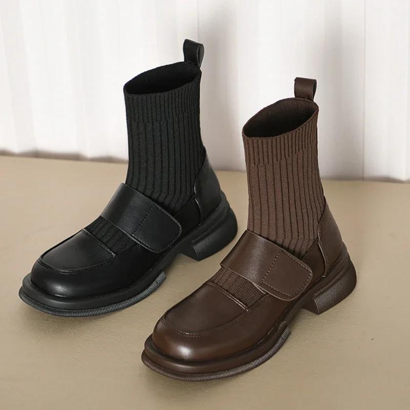 Модные осенние женские ботильоны, модные мягкие кожаные женские элегантные короткие ботинки на низком каблуке, женские удобные вязаные ботильоны без застежек 2024
