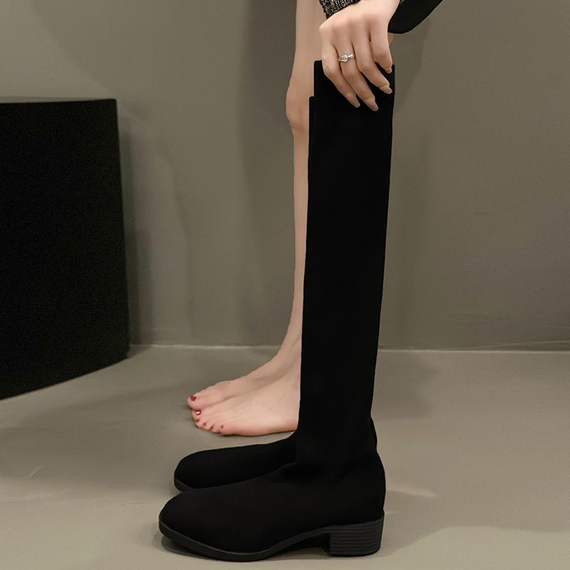 Модные длинные сапоги-трубы с круглым носком и толстым каблуком на весну и осень-зиму для женщин, эластичные вязаные сапоги до колена
