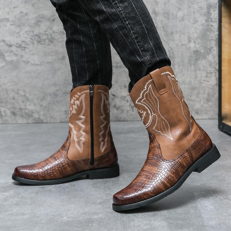Брендовые мужские вышитые ковбойские сапоги в западном стиле, модные новые стильные удобные высокие сапоги из крокодиловой кожи с боковой молнией