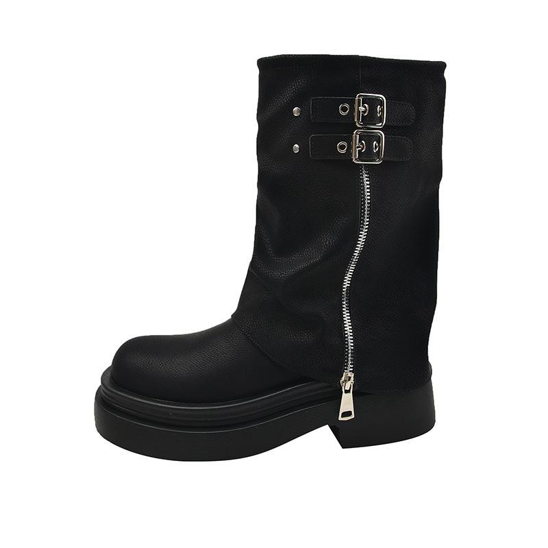 Модные ботинки на толстой платформе для женщин 2024 новые колготки ковбойские сапоги на молнии с ремнем и пряжкой ботинки для женщин ботильоны из искусственной кожи