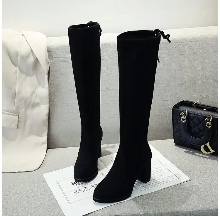 Модные женские сапоги из искусственной замши на каблуках, осенние, на молнии, эластичные, до колена, для женщин, черные, на шнуровке, Botas Mujer 9222
