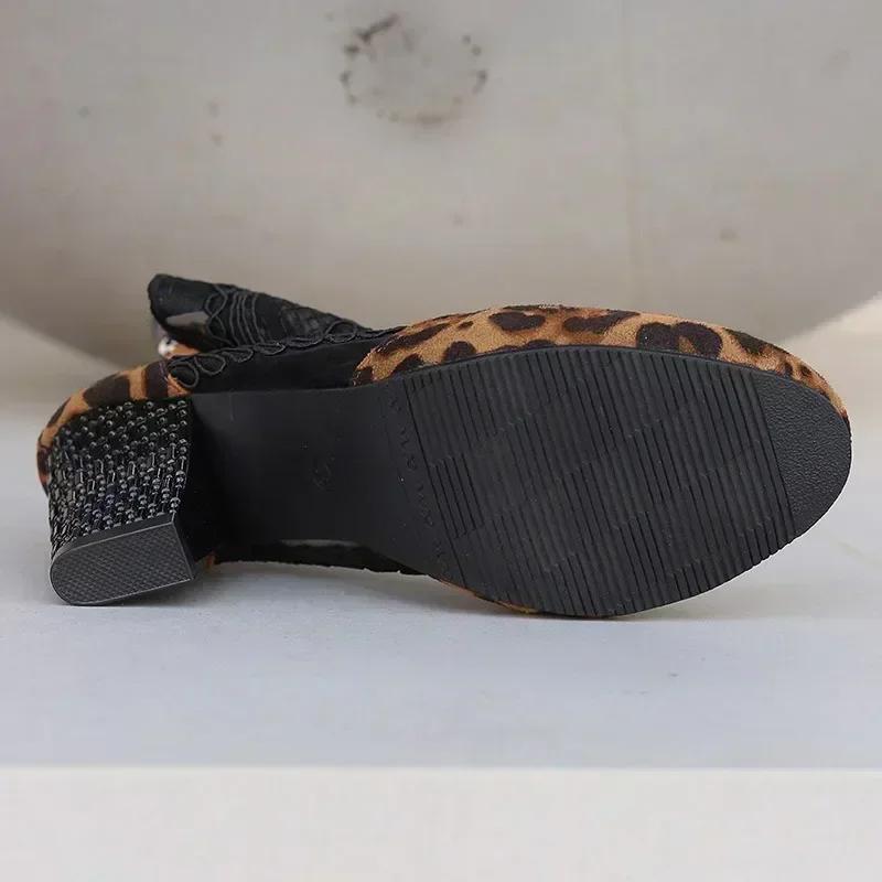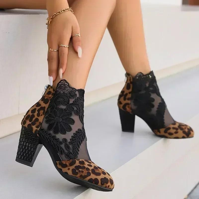 Мода 2024 Новости Женщины Высокий каблук Круглый носок Женская обувь Сандалии Женские сапоги Леопардовый принт Ботильоны Женские кружевные цветочные сзади Молния