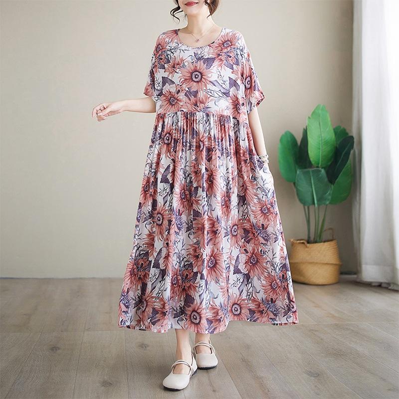 Простое модное длинное платье с летним принтом и короткими рукавами и круглым вырезом — купить товар онлайн с бесплатной доставкой до всему миру!