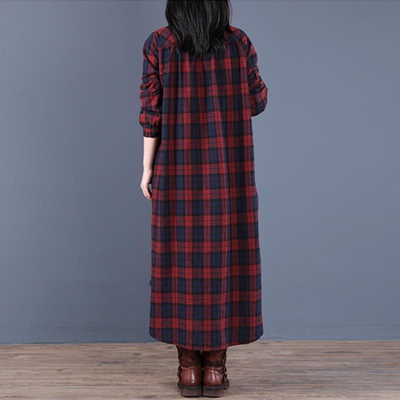Платье-рубашка средней длины с карманами и лацканами из хлопка и льна в клетку с длинными рукавами для женщин