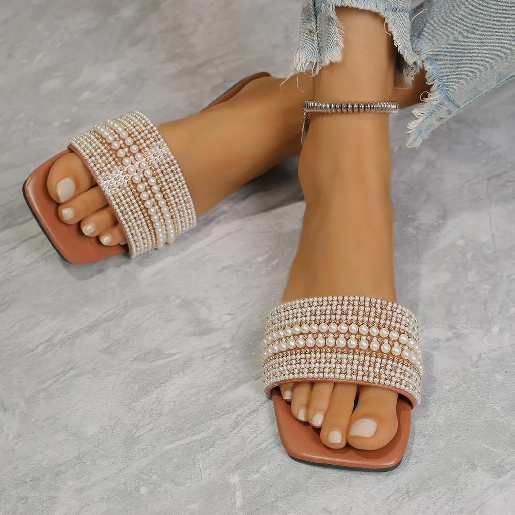 Модные женские роскошные тапочки с жемчугом 2024 года, летние сандалии с квадратным носком, удобные нескользящие пляжные шлепанцы, большой размер 43