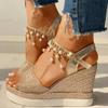 Мода 2024 года, новые женские босоножки на танкетке, летние босоножки на платформе с бусинами и заклепками, с пряжкой на ремешке, с открытым носком, на толстой подошве, повседневная обувь для женщин