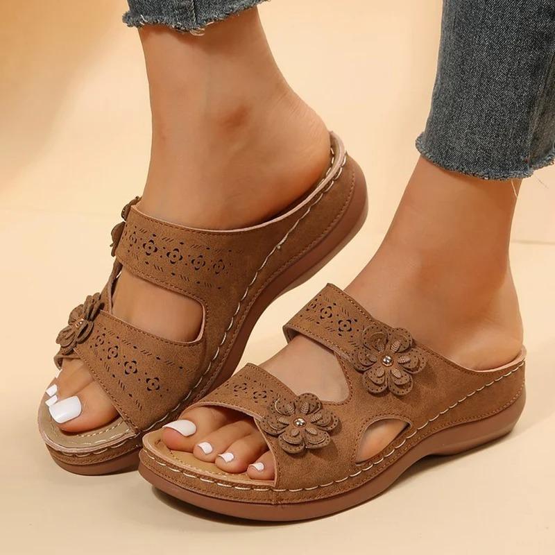 Модные тапочки с цветочным принтом для женщин, летние босоножки на танкетке из искусственной кожи, женские удобные нескользящие пляжные шлепанцы